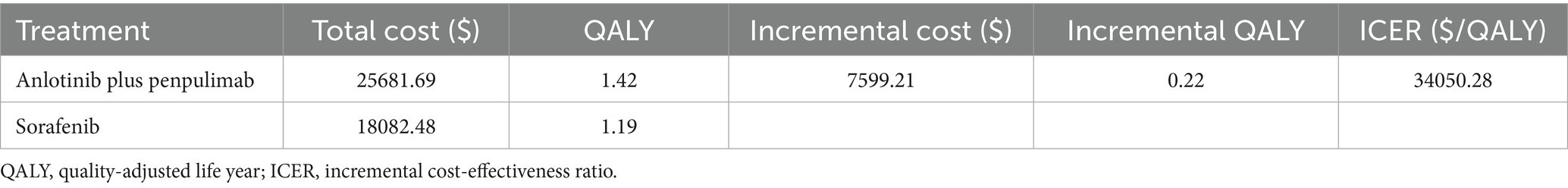 Conclusion: Anlotinib plus penpulimab represents a potentially cost-effective first-line treatment for advanced HCC from a Chinese healthcare system perspective. These findings support incorporating this regimen into guidelines for selecting cost-effective immunotherapeutic strategies and provide evidence to inform decision-making about resource allocation for advanced HCC management.