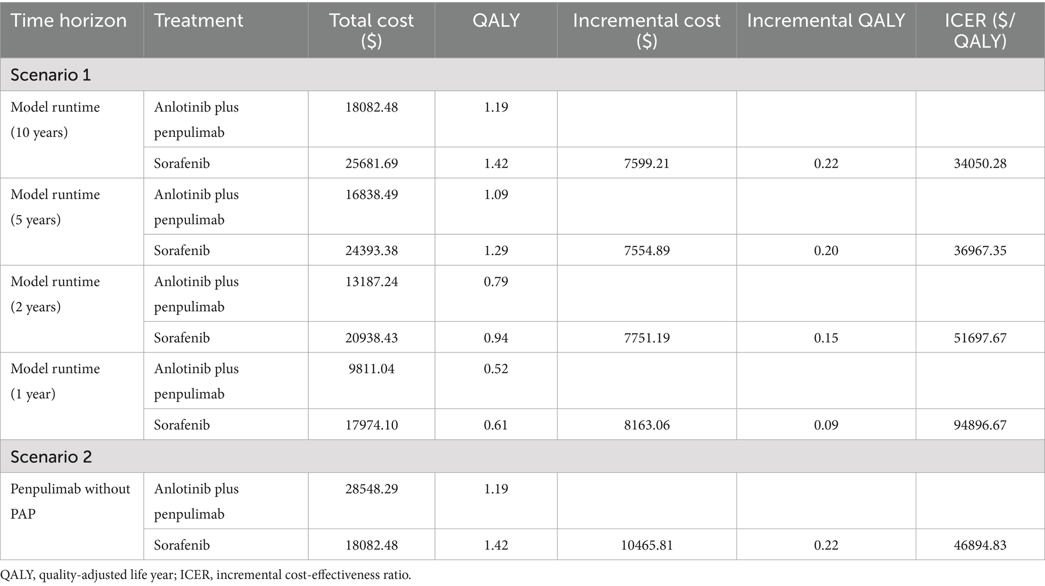 The results of the scenario analysis are presented in Table 4. In scenario 1, when the model time horizon was changed to 1, 2, 5, and 10 years, the ICERs of anlotinib plus penpulimab vs. sorafenib were $94896.67, $51697.67, $36967.35, and $34050.28 per QALY, respectively. As the duration increased, the ICER gradually decreased. In scenario 2, when the PAP was excluded, the ICER increased to $46894.83 per QALY, which was above the WTP threshold, indicating that the regimen ceased to be cost-effective under this scenario.