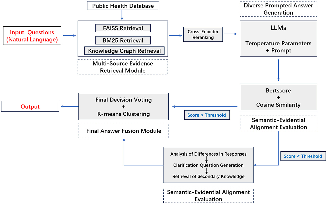 First, the Multi-Source Evidence Retrieval (MSER) Module aggregates heterogeneous information through FAISS-based dense retrieval, BM25 keyword search, and biomedical knowledge graphs, thereby improving both recall and factual grounding (30–32). Second, the Diverse Prompted Answer Generation (DPAG) Module generates multiple candidate answers via prompt-based LLM sampling, which are then reranked using cross-encoder relevance scoring (33). Third, the Semantic-Evidential Alignment Evaluation (SEAE) Module evaluates answer consistency by calculating cosine similarity and BERTScore-based alignment with the retrieved evidence (34–36). Finally, the Discrepancy-Identified Self-Clarification (DISC) Module detects semantic divergence across answers, formulates clarification questions, and performs secondary retrieval with knowledge-guided editing to resolve conflicts.