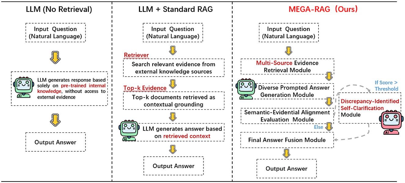 This multi-evidence, multi-stage refinement process enables MEGA-RAG to deliver more accurate, trustworthy, and policy-aligned responses compared to both standard LLMs and conventional RAG methods.