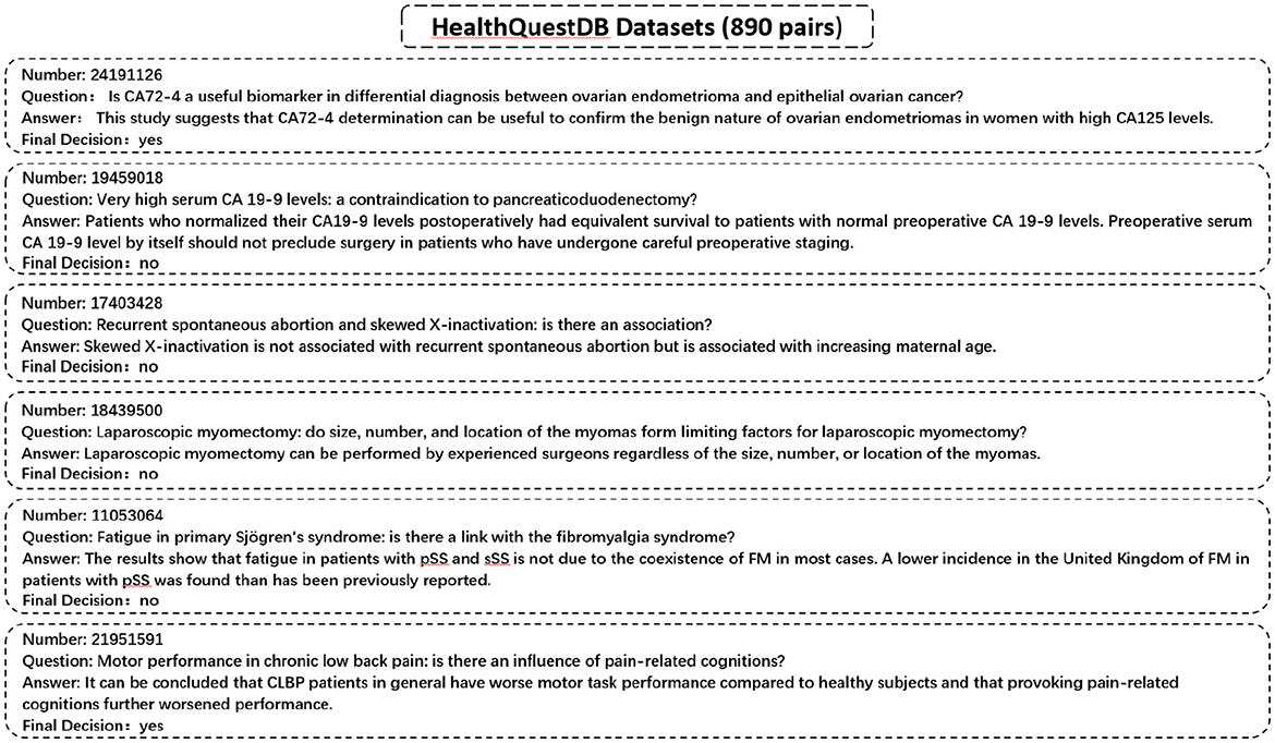 The HealthQuestDB dataset was annotated by two domain experts to ensure clarity and reproducibility. The annotation process covered the following aspects: - Selection of question-answer pairs. - Labeling of binary outcomes (yes/no). - Handling of ambiguous or context-dependent cases. - Long-form answers were required to capture nuanced evidence beyond the binary label.