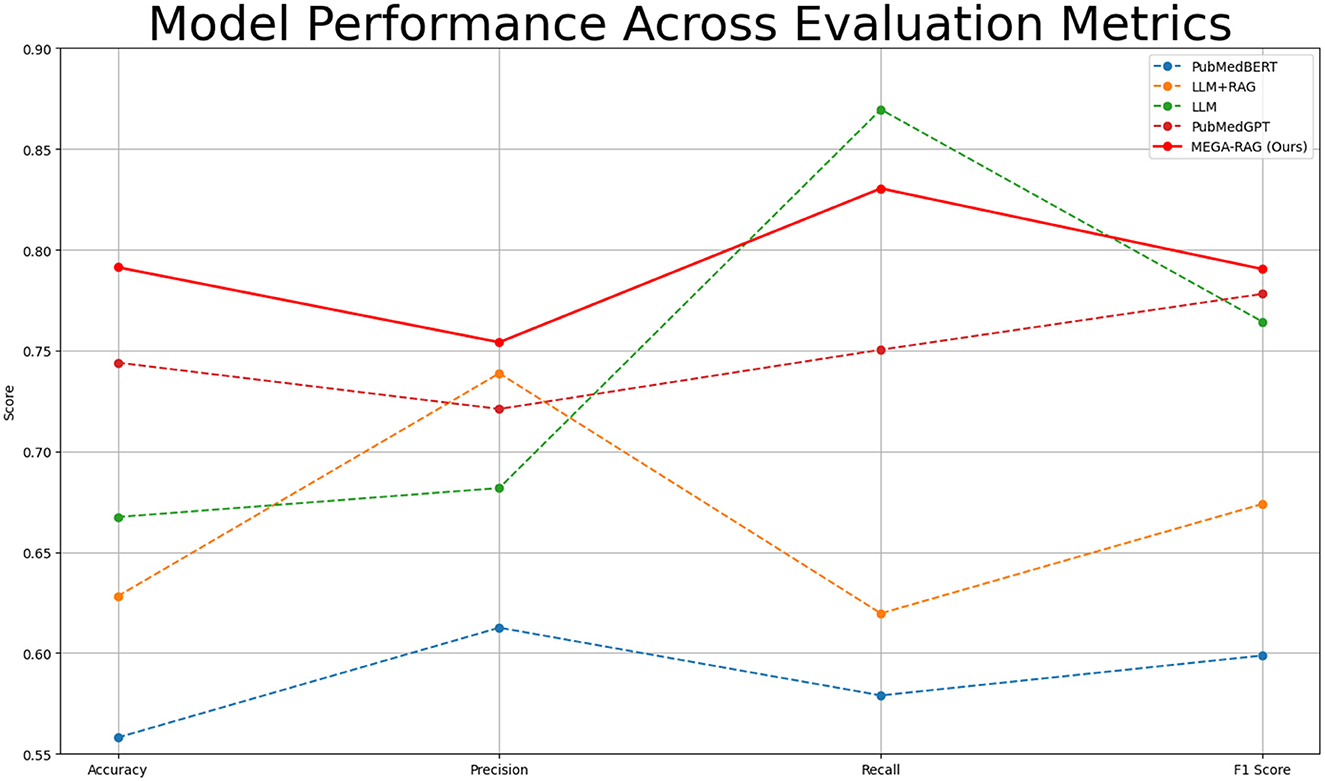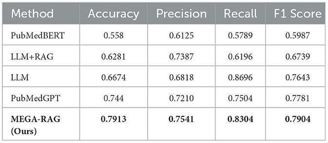 To assess the effectiveness of our method in reducing hallucinations in large language models, we use four key evaluation metrics: Accuracy, Precision, Recall, and F1 Score. These metrics allow us to rigorously evaluate whether MEGA-RAG reduces erroneous or fabricated outputs and ensures reliable, evidence-based responses in public health scenarios. Table 2 and Figure 4 provide a summary of the comparative performance across these metrics.