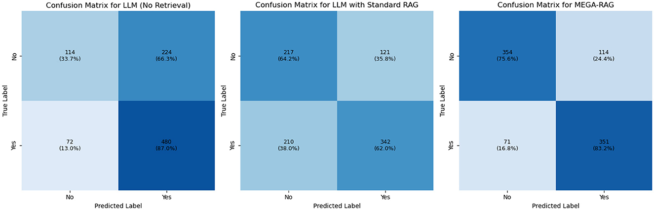 We conducted confusion matrix analyses for LLM, LLM+RAG, and MEGA-RAG. The pure LLM model produced 224 false positives and 72 false negatives, achieving high recall but suffering from an inflated false-positive rate. Introducing standard RAG reduced false positives by nearly half (121) and improved precision, but resulted in 210 false negatives, indicating missed positive cases. In contrast, MEGA-RAG achieved the best balance with only 114 false positives and 71 false negatives, demonstrating superior overall accuracy and reliability for public health question answering, as shown in Figure 5. To enhance interpretability, the confusion matrices in Figure 5 have been normalized by row, displaying percentage values in addition to raw counts, with each cell annotated accordingly. This normalization facilitates clearer comparisons across models under class-imbalanced conditions.