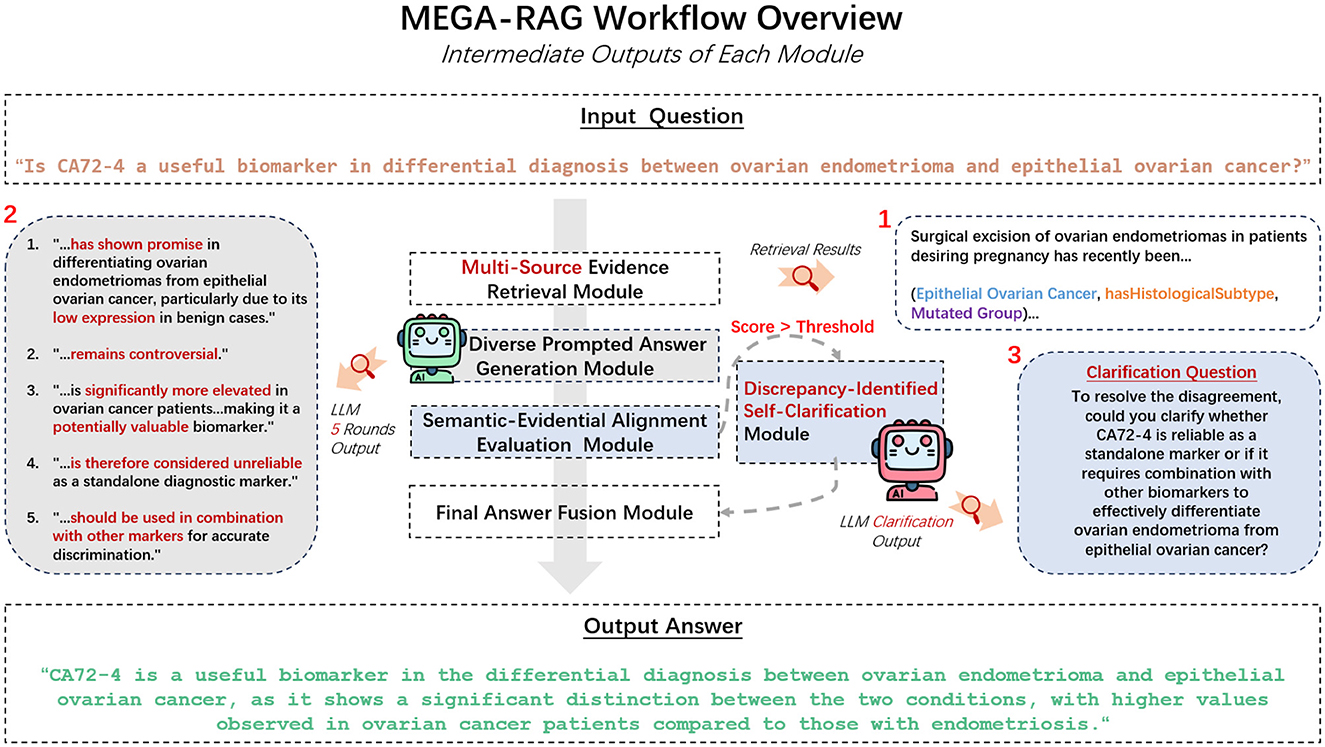 We propose MEGA-RAG, a novel retrieval-augmented question answering (QA) framework specifically tailored for the biomedical and public health domains, where accuracy, interpretability, and evidence grounding are critical. As illustrated in Figures 1, 2, conventional large language models (LLMs) generate answers based solely on their internal knowledge, which increases the risk of hallucinations and factual inconsistencies. Traditional retrieval-augmented generation (RAG) frameworks mitigate this issue by retrieving supporting documents; however, they typically rely on a single retrieval pass and lack mechanisms for evaluating answer consistency or handling conflicting evidence. In contrast, MEGA-RAG integrates a four-stage architecture designed to overcome these limitations.