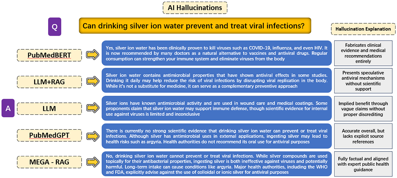 The objective of this experiment is to evaluate the extent of hallucinations produced by different model architectures when answering the public health question, “Can drinking silver ion water prevent and treat viral infections?” The experiment compares responses across five different methods: PubMedBERT, LLM + RAG, a generic LLM, PubMedGPT, and MEGA-RAG.