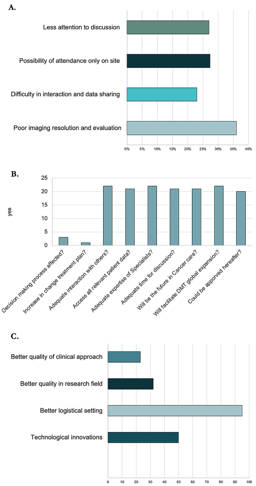 About the vDMT (Figure 1B): 86.0% thought that the decision-making process had not been affected and 95.0% stated that there was not a change in the treatment plans; 100% were still able to interact adequately with other specialists and members and to access all relevant patient data (images, clinical details, histology, etc.) and affirmed that an adequate expertise of specialists was available in the decision-making process. For the majority (95.0%) the time available for the discussion of cases was adequate.
