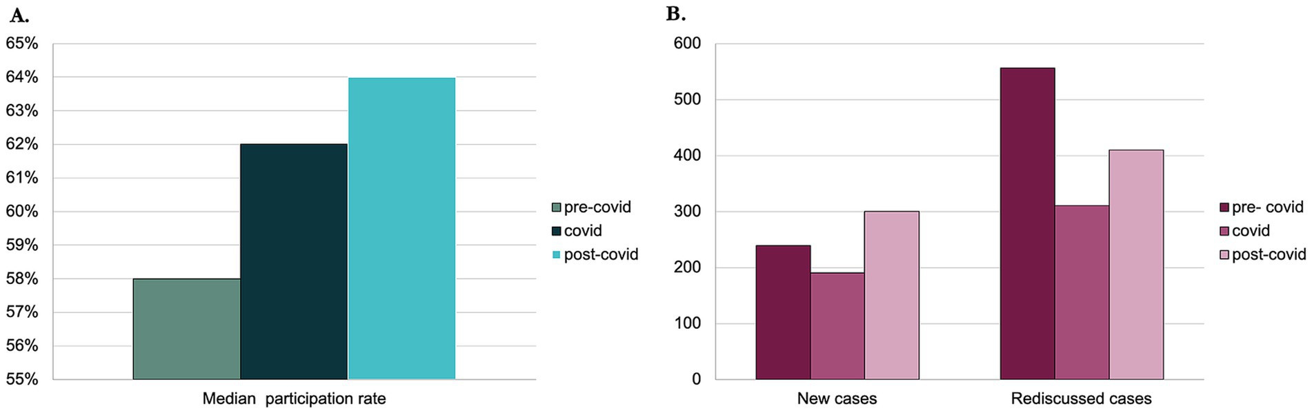 Figure 2. Data from Institutional DMT. (A) Bar chart representing the rise of participation rate between the pre-covid, covid, and post-covid periods. (B) Bar chart representing the number of new cases and re-discussed ones between pre-covid, covid, and post-covid periods.