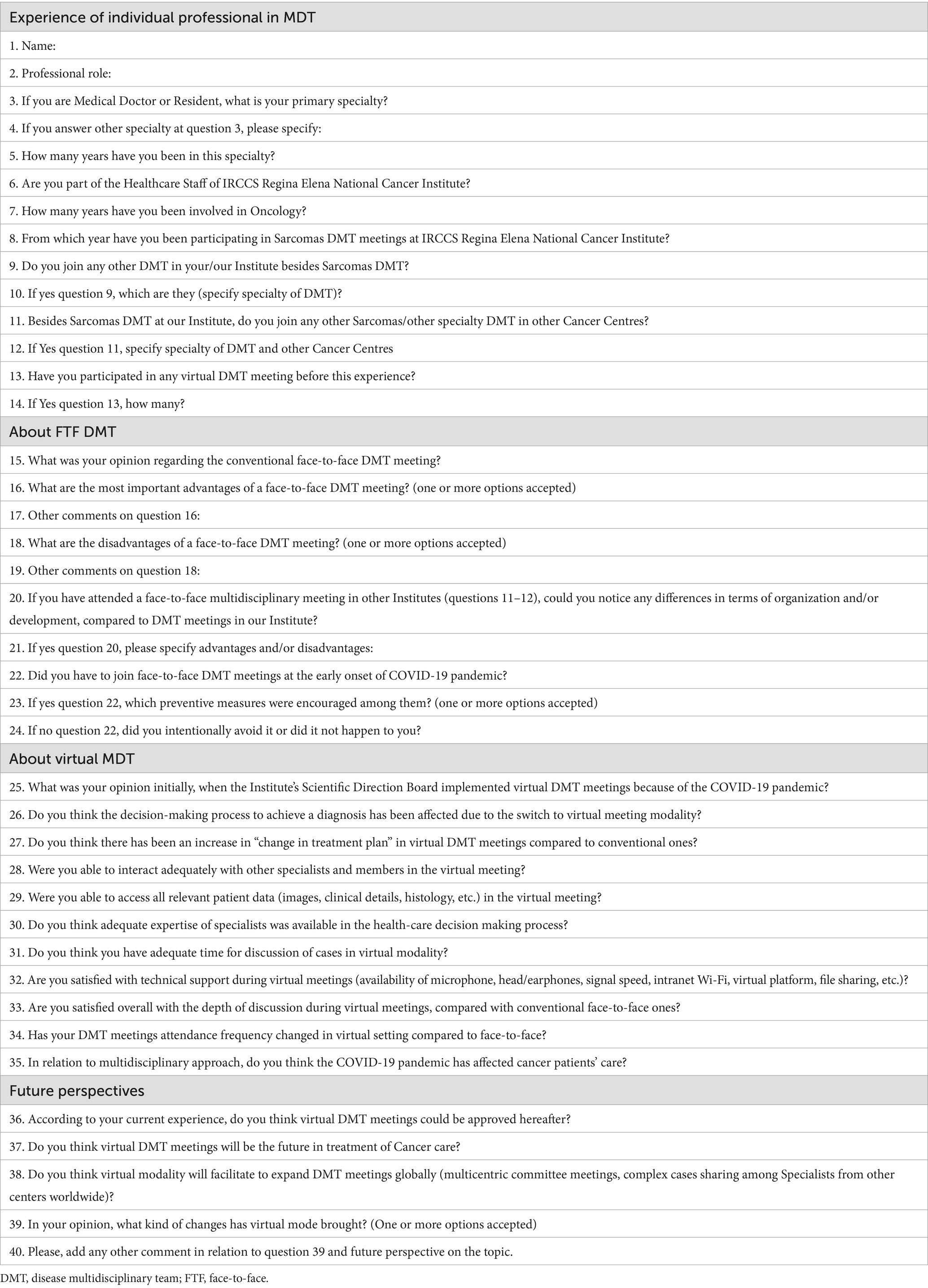 We formulated 40 questions, divided in four sections: the first section (14 questions) was about the experience of individual professional in DMT; the second section (10 questions) asked opinions about FTF meetings; the third (11 questions) about the virtual one; the last section (5 questions) inquires about the future perspectives of the online modality. Questions contemplated 12 yes/no answers, 15 multiple choice answers with one or more items to be selected, two 5-points Likert scale, and 11 open answers. The survey was conceived by one medical doctor participating in DMT meetings and independently reviewed by three other medical doctors participants in sarcoma DMT meetings, before starting the study.