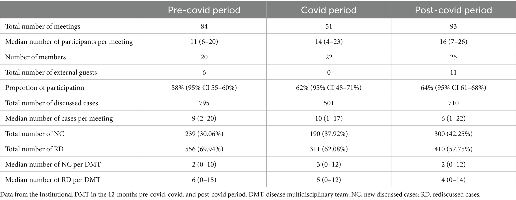 We also analysed in a retrospective way the registries of all the DMT meetings held from 9 March 2019 to 8 March 2022 including data about numbers of participants, numbers of external participants, and numbers of discussed cases (new cases vs. known cases discussed several times).