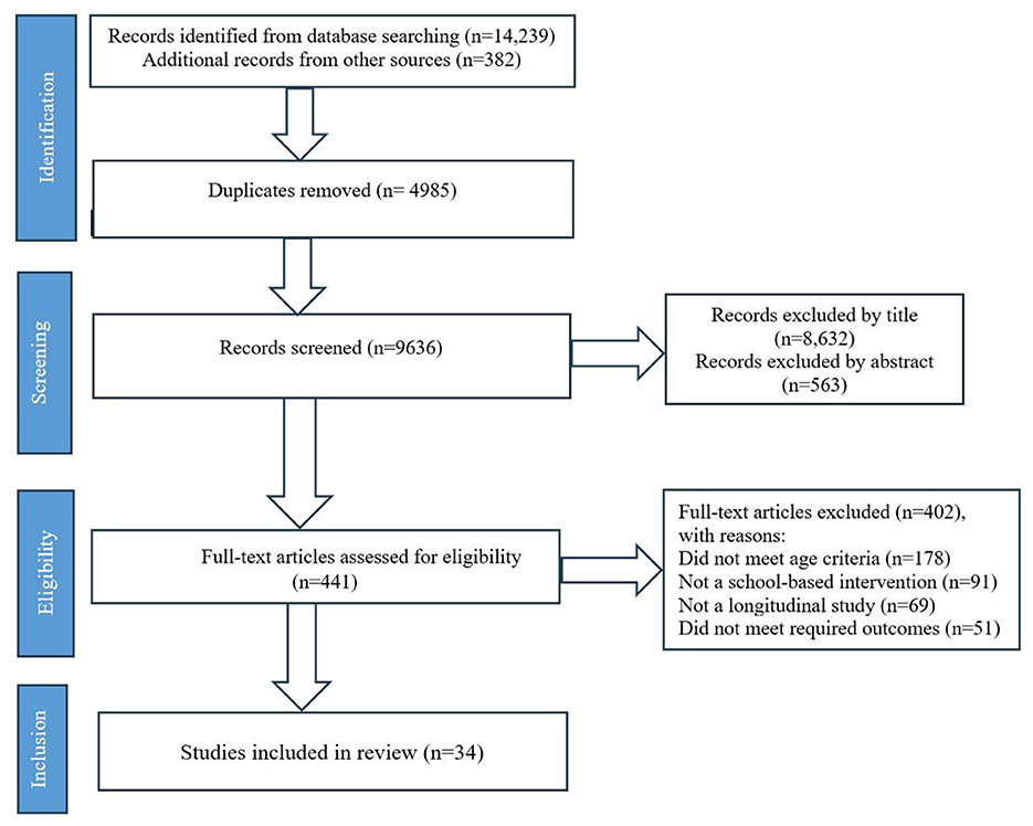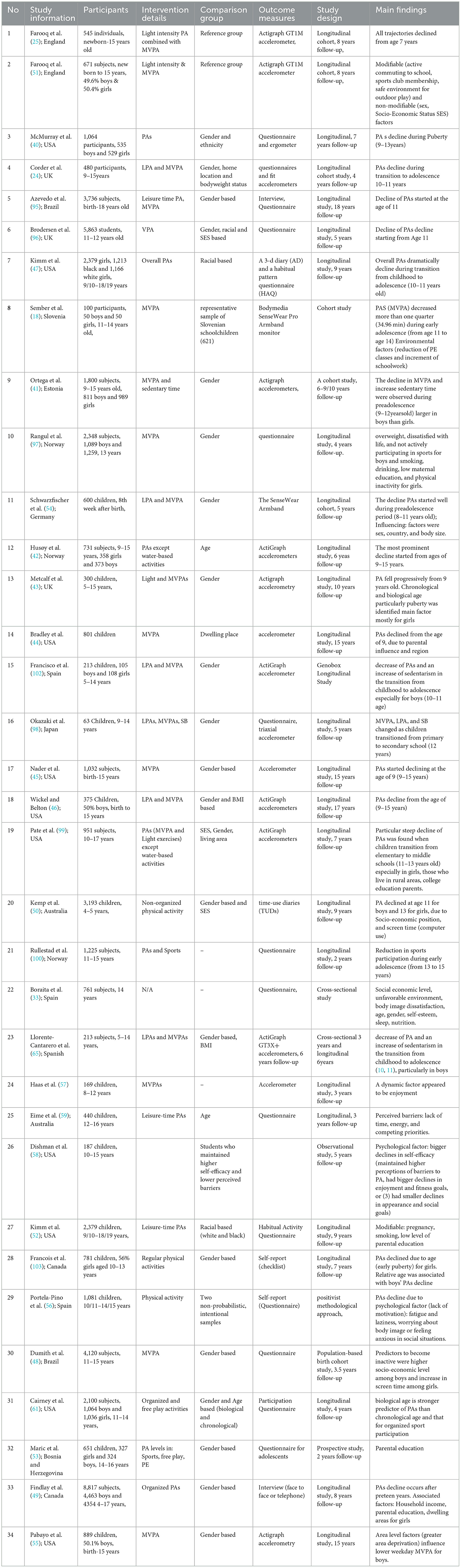The eligibility criteria for study inclusion in this systematic review were based on the PICOS framework (101). Specifically: (a) Participants: Studies focusing on children and adolescents, both boys and girls aged 6–18 years, enrolled in elementary and secondary schools with prescribed physical education; (b) Intervention: Studies that utilized physical education (PE) classes or extra-curricular activities within school settings as the intervention medium; (c) Comparison: Children categorized in the age group immediately preceding the intervention group (6–18 years old) i.e., younger vs. older children; (d) Outcomes: Studies reporting on PA levels, including maintenance, decrease, or increase in PA and the associated factors; and (e) Study Design: Longitudinal studies, follow-up, prospective, cohort were included to capture changes in PA over time. These criteria ensured a focused and consistent approach to study selection, allowing for a comprehensive examination of the effects of PE interventions on PA patterns across childhood and adolescence.