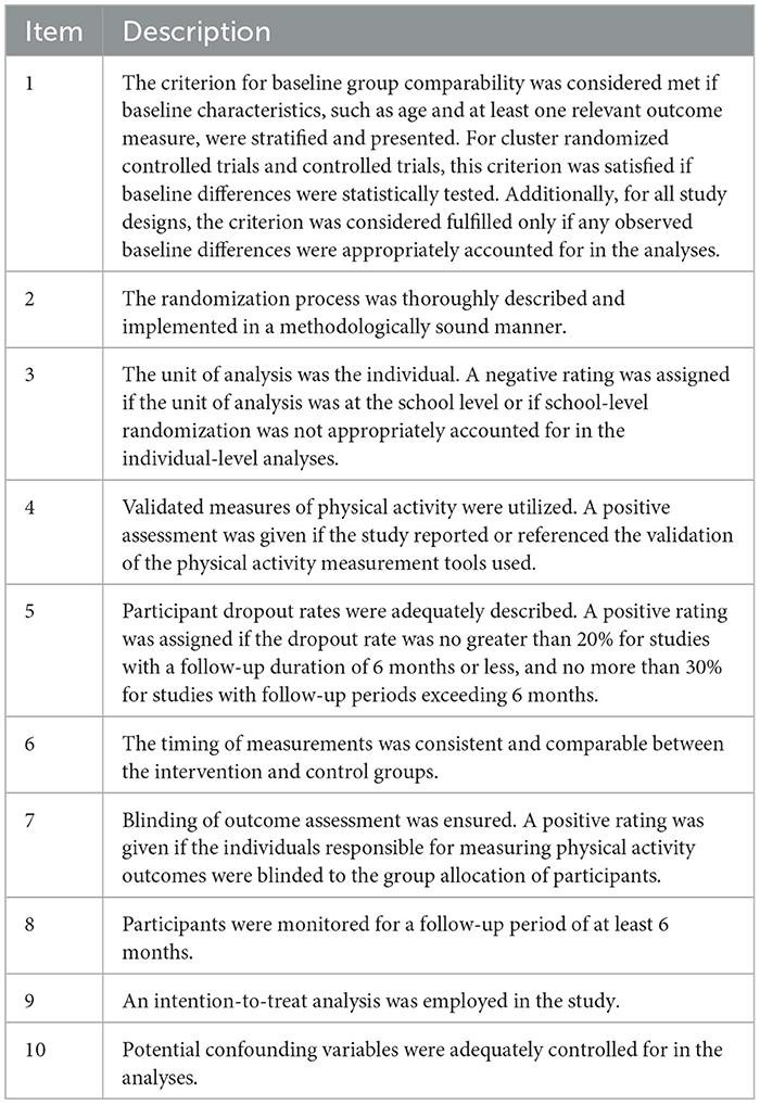 The methodological quality (risk of bias) of the included studies was evaluated using a 10-item quality assessment scale adapted from Van Sluijs et al. (39) (Table 2). The tool was specifically tailored to assess the methodological rigor of studies exploring PA interventions among children and adolescents. For each study, two independent reviewers assessed whether each item on the scale was present or absent. A score of “present” was assigned if the study provided adequate description and compliance with the criterion. If the description was inadequate or missing information the item received an “absent” score. While the “unclear” score was assigned in case of insufficient or ambiguous information, authors were contacted for clarification when necessary. Disagreements were resolved by the lead author through article reassessment. Table 2 provides detailed descriptions of each quality assessment criterion.