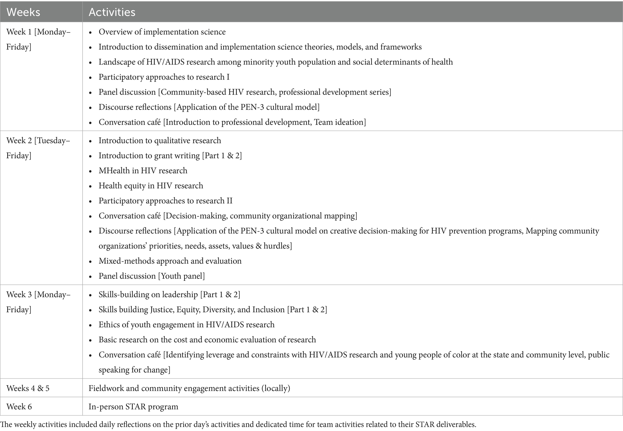 Following the designathon, the STAR cohort participated in a 6-week hybrid summer innovation bootcamp. An innovation boot camp is an accelerated training program designed to build capacity for implementing solutions and typically follows a designathon to provide participants with research and project strategy skills (22). The bootcamp comprised of 3-weeks synchronous and asynchronous sessions, 2 weeks of fieldwork at a collaborating community partner organization (during this phase, the scholars gained feedback on their ideas from their community partners. It was also an opportunity to understand the feasibility of implementing their proposed solutions in collaboration with the community partners), and 1 week of in-person activities.