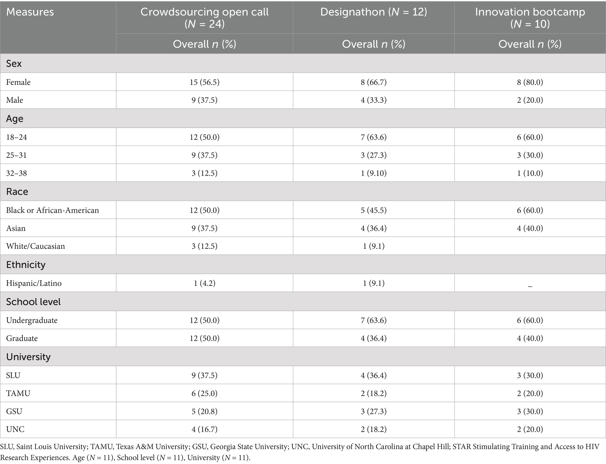 We received 24 fully completed submissions (SLU = 9; TAMU = 6; GSU = 5; and UNC = 4). The majority of the entries were from individuals who identified as women (56.5%) and Black or African-American (50.0%). The mean age of applicants was 24.5 years. Table 2 provides the demographics of eligible submissions to the crowdsourcing open call and details of who progressed on to the designathon and bootcamp phases.