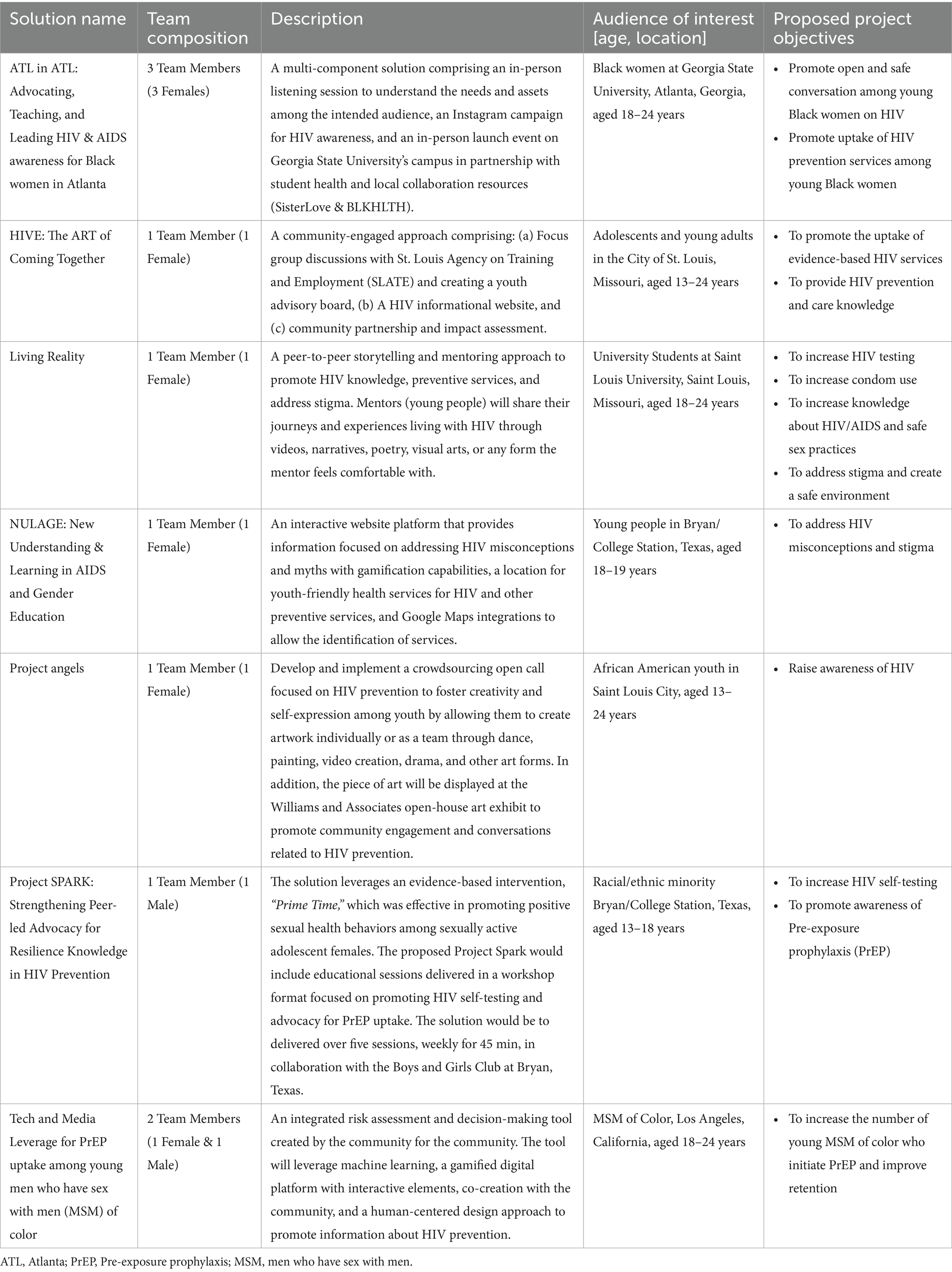 The STAR bootcamp culminated in seven proposals led by the STAR scholars, with support from the research team, mentors, and participatory learning community engagements. The various teams proposed diverse strategies to promote HIV prevention and awareness and address stigma among youth and minoritized populations. Most of the solutions involved some community-engagement components through activities such as listening sessions with a community interested in learning about their needs, resources, and assets; peer engagement through youth advisory boards; crowdsourcing open calls to generate innovative and creative solutions from young people for HIV prevention; art exhibits; and storytelling. In addition, technology-driven solutions were also suggested, including leveraging machine learning for risk assessment and tailoring of health information, using social media campaigns, gamified platforms for HIV education, and an interactive website for the geolocation of youth-friendly services for HIV. Overall, the solutions focused on some HIV prevention objectives, including reducing HIV stigma, promoting HIV knowledge, or the uptake of preventive services such as HIV testing and PrEP. The proposed solutions by the STAR scholars are provided in Table 3. Judges scores of the teams’ solutions are provided in Appendix 4.