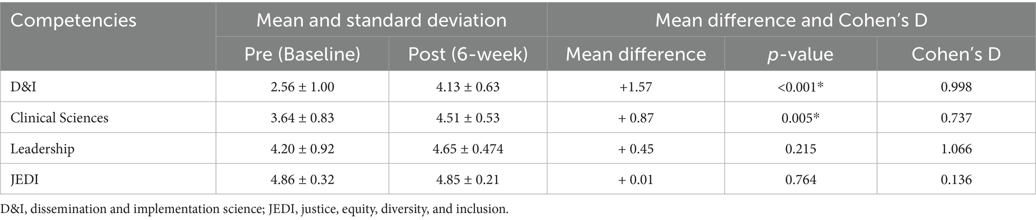 A pre-post assessment of the core competencies of the STAR program showed an overall improvement in the four areas: (a) dissemination and implementation science (D &I), (b) clinical sciences, (c) leadership, and (d) JEDI. However, only the increase in D&I and clinical sciences knowledge was statistically significant. The difference in D & I knowledge at baseline and the completion of the boot camp had a large effect size (Cohen’s d = 0.99). The difference in Clinical sciences knowledge at baseline and the completion of the boot camp had a moderate effect size (Cohen’s d = 0.74). Table 4 provides a summary of this assessment.