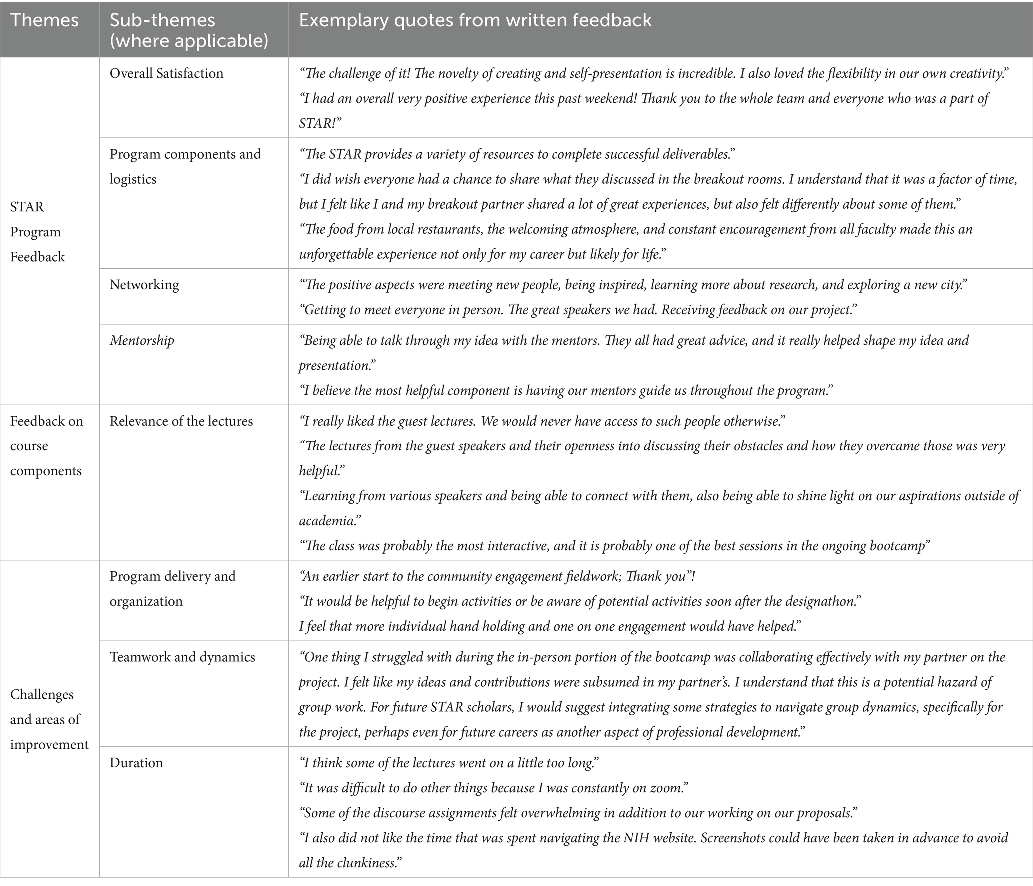 A qualitative evaluation of the innovation bootcamp among the STAR scholars shows an overall positive experience with the STAR program and its contents. In addition, the scholars highlighted some areas for improvement in the boot camp experience. Three main qualitative themes emerged from our analysis of the scholars’ responses to open-ended questions on pre- and post-program evaluation surveys: (a) STAR boot camp feedback. This included feedback on overall satisfaction with the program, program components and logistics, networking, and mentoring components, (b) feedback on course components, and (c) some challenges experienced and areas of improvement. This included some challenges experienced in program delivery and organization, teamwork, dynamics, and course durations. The emerging themes and corresponding sub-themes, where applicable, and quotes from the written feedback on the survey are provided in Table 5.