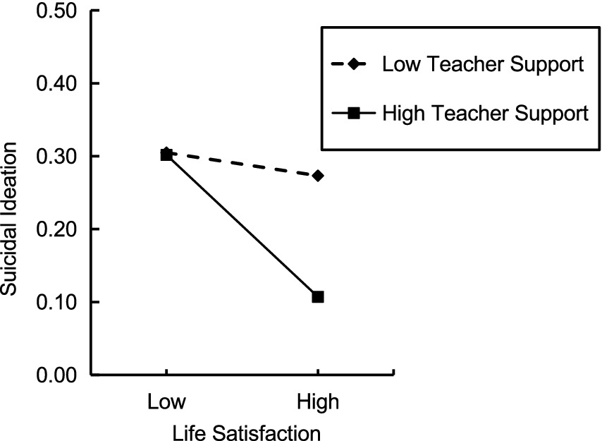 Although relatively limited, existing research has provided evidence on the moderating effect of social support in the direct relationship between promotive factors and suicidal ideation [(e.g., 32, 33)]. Specifically, Zhang et al. (33) found that for Chinese older adults with higher support from nursing, resilience was significantly associated with lower suicidal ideation. The association between emotional intelligence and suicidal ideation was negatively significant among Spanish adolescents with high family support (32). Compared to peer support, teacher support is a more significant moderator and protective factor for Chinese adolescent suicidal inclination (28). Thus, we anticipate that the association between life satisfaction and suicidal ideation is stronger among adolescents with high rather than low teacher support.