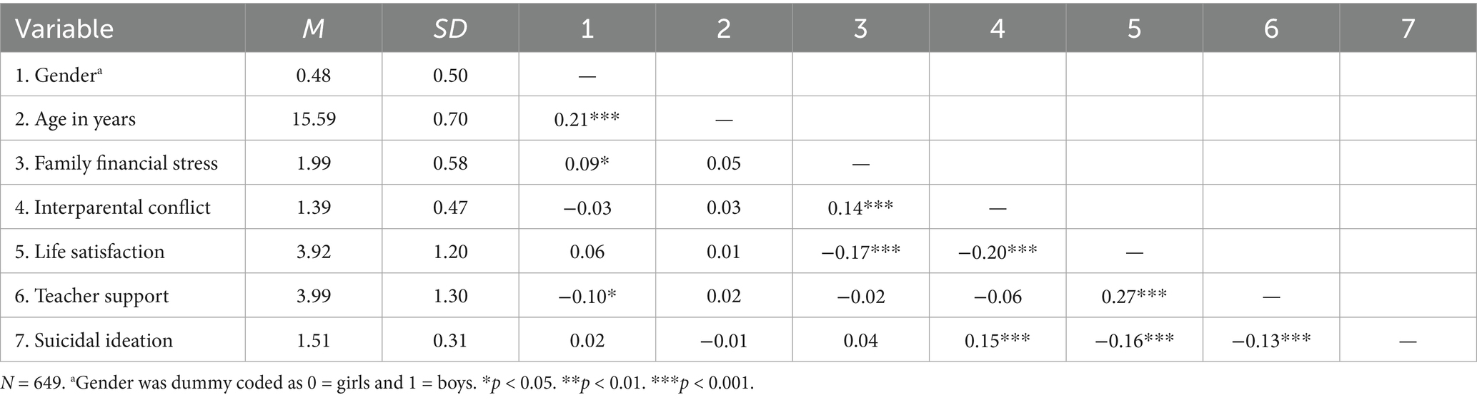 Table 1 presents univariate and bivariate statistics, including means and standard deviations, for all study variables. Within the total sample, 21.9% (n = 142) of participants reported experiencing suicidal ideation in the preceding 6 months. Specifically, 71.8% (n = 507) of participants gave a rating of 0 (never), 20.2% (n = 131) of participants gave a rating of 1 (occasionally), and 1.7% (n = 11) of participants gave a rating of 2 (frequently). Interparental conflict was positively correlated with suicidal ideation. Both life satisfaction and teacher support were negatively correlated with suicidal ideation. Teacher support was positively correlated with life satisfaction. Results were as expected.