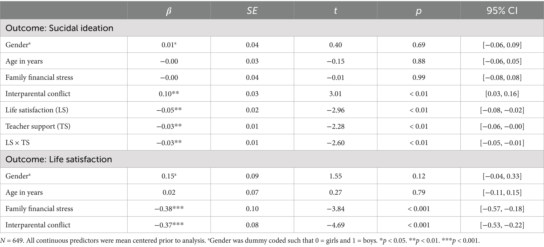 Results: The mediation analysis showed that a significant indirect relationship between interparental conflict and suicidal ideation, mediated by life satisfaction (β = 0.02, 95% CI [0.01, 0.04]). The moderation analysis revealed that teacher support moderated the relationship between life satisfaction and suicidal ideation (β = −0.03, p < 0.01). The relationship between life satisfaction and suicidal ideation was significant for adolescents who perceived high teacher support (β = −0.08, 95% CI [−0.12, −0.04]) but not for those who perceived low teacher support (β = −0.01, 95% CI [−0.05, 0.03]).