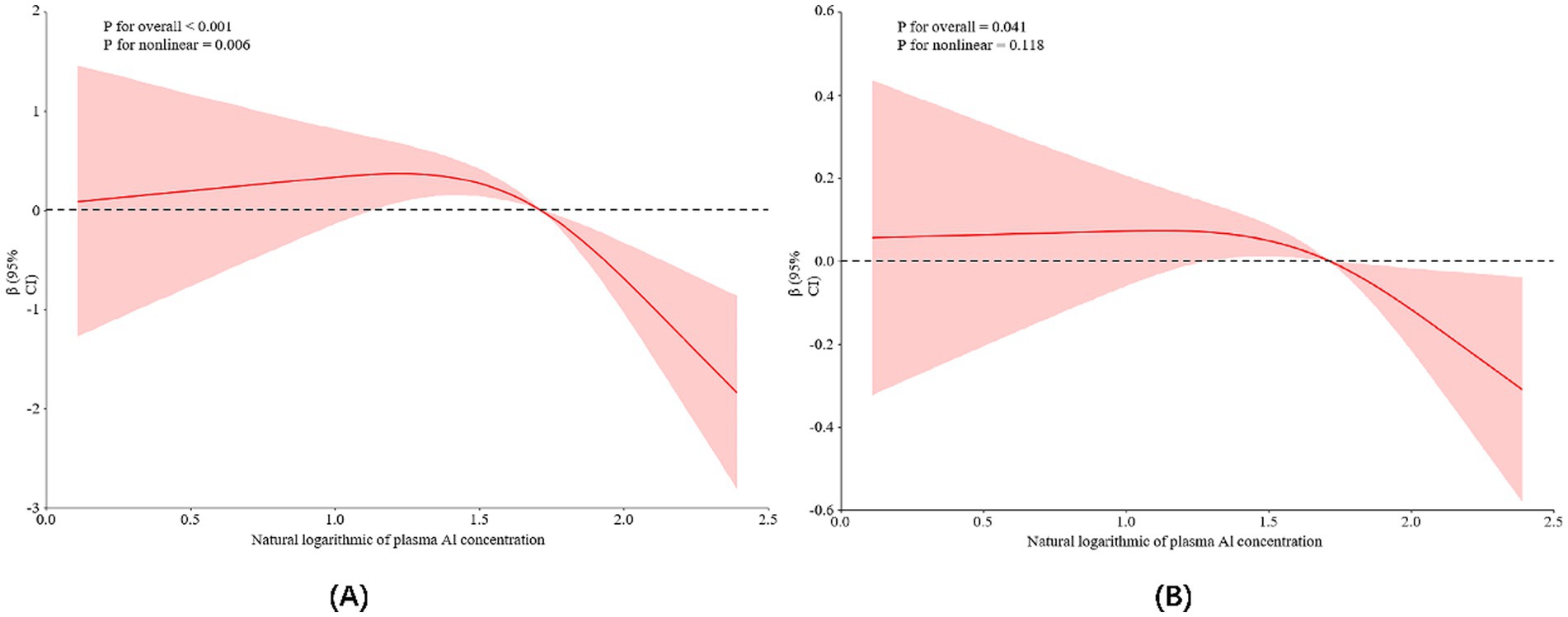 Figure 1. Restricted cubic spline model representing the association between log-transformed plasma aluminum concentrations and cognitive scores (A) and HRR levels (B). The mentioned cognitive scores and HRR levels are adjusted for age, BMI, length of service, per capita monthly household income, smoking and alcohol consumption, education level, exercise, and marital status. Red curves: indicate the association between plasma aluminum concentration and cognitive scores or HRR levels; pink shaded areas: indicate 95% confidence intervals for β values.