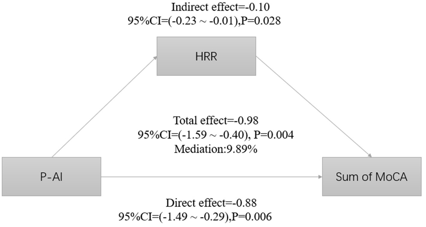 HRR was included as a continuous variable in the multiple linear regression model for statistical analysis, and the results showed that there was a significant positive correlation between HRR and the total MoCA score. Specifically, as the HRR increases, the total MoCA score also increases, i.e., for every unit change in HRR, the total MoCA score increases by 0.45 points on average (Table 6).