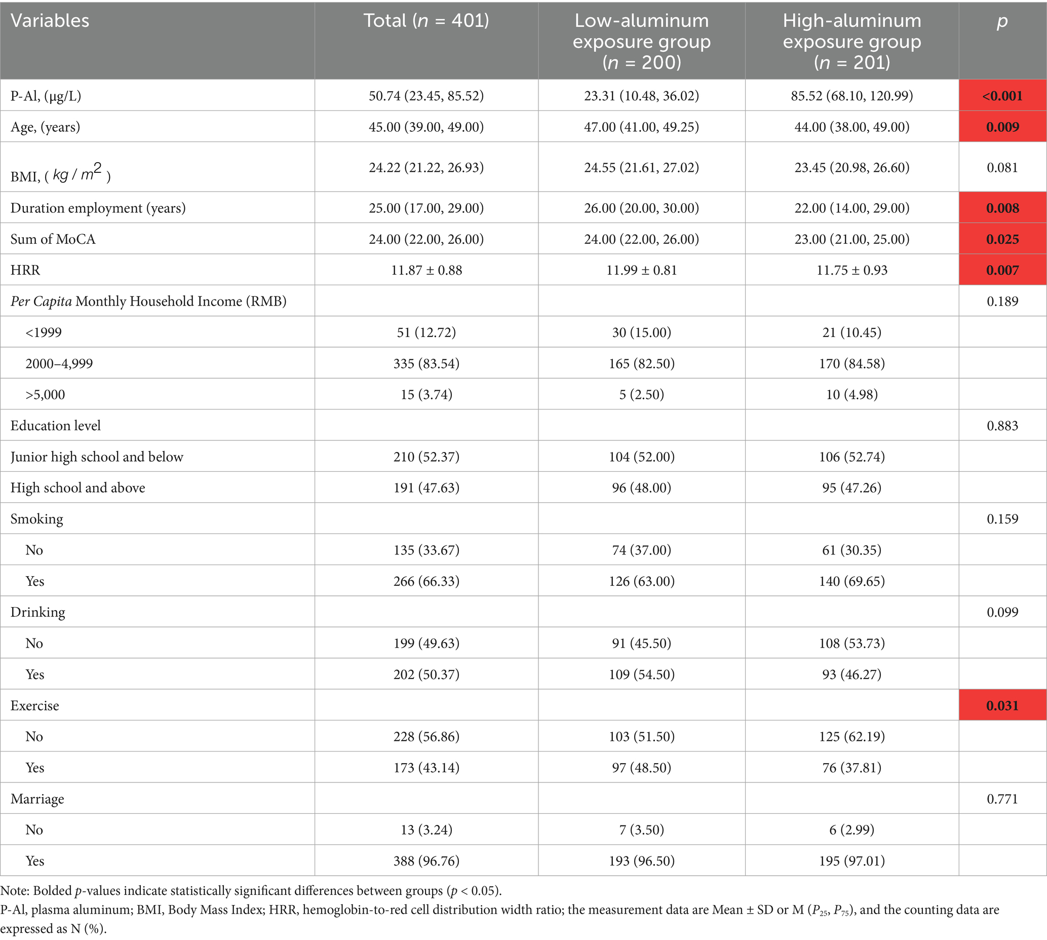 A total of 401 male workers participated in this study. The age of the study participants M ( ) was 45.0 (23.0, 57.0) years, the length of service M ( ) was 25.0 (3.0, 39.0) years, the average per capita monthly income of the family was mostly in the range of 2000–4,999 yuan (83.54%), most of them were alcohol drinkers (50.37%), and more than half of the male workers smoked cigarettes (66.33%). The percentage of infrequent exercisers was higher (56.86%), and marital status was mainly married (96.76%). Table 1 summarizes the general demographic characteristics grouped by blood aluminum concentration, there were statistically significant differences between the two groups in terms of age, length of service, exercise status, plasma aluminum level, HRR ratio and total MoCA score (p < 0.05), while the differences in BMI, education level, per capita monthly household income status, smoking, alcohol consumption, and marital status were not statistically significant (p > 0.05).