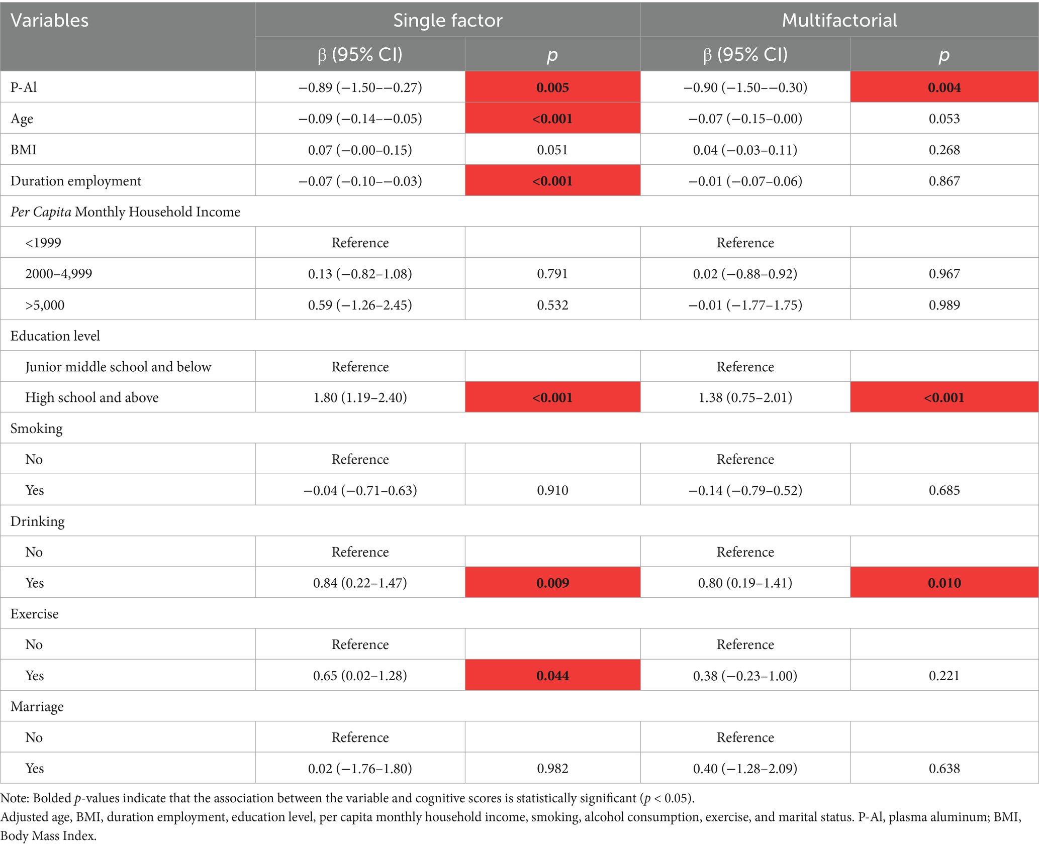 In the present study, we employed the MoCA scale to evaluate workers’ cognitive performance, as it demonstrates high sensitivity (up to 90%) for early-stage MCI detection (31). Studies have confirmed cognitive impairment associated with environmental aluminum exposure: when analyzed as a continuous variable, each e-fold increase in plasma aluminum concentration was associated with a 0.328-point decreased in total MoCA score; when treated as a categorical variable, plasma aluminum concentration showed a negative correlation with MoCA scores (32); An animal studies provide corroborating evidence, sub-chronic(60-day) low-dose aluminum exposure in Wistar rats through chow and drinking water induced could reach thresholds sufficient to promote memory impairment and neurotoxicity (33). Additionally, shuttle box experiments revealed dose-dependent learning and memory deficits and showed that sub-chronic aluminum exposure impaired learning and memory, cognitive impairment, and hippocampal histological changes are more pronounced with higher aluminum intake (34).