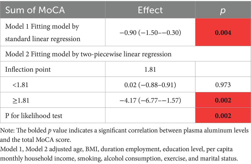 In addition, the RCS model confirmed the dose-effect relationship between plasma aluminum concentration and total MoCA score, as shown in Figure 1A. A nonlinear relationship between aluminum exposure and total MoCA score could be seen based on the RCS curves, and a threshold effect analysis showed that there was a threshold effect between the level of aluminum exposure and total MoCA score (p = 0.002). As seen in Table 3, when the natural logarithmic value of blood aluminum concentration was lower than 1.81, no significant association was found with the MoCA score; when it was higher than 1.81, the aluminum exposure level was negatively associated with the MoCA score [β = −3.85, 95% CI (−6.42–1.28)], suggesting that the association between aluminum exposure and cognitive impairment was significantly strengthened when the plasma aluminum concentration was above the threshold, and this threshold may reflect the critical point where aluminum breaks through the physiological defense mechanism and triggers neurotoxicity. This finding provides an important basis for the development of safety standards for aluminum exposure and early intervention.