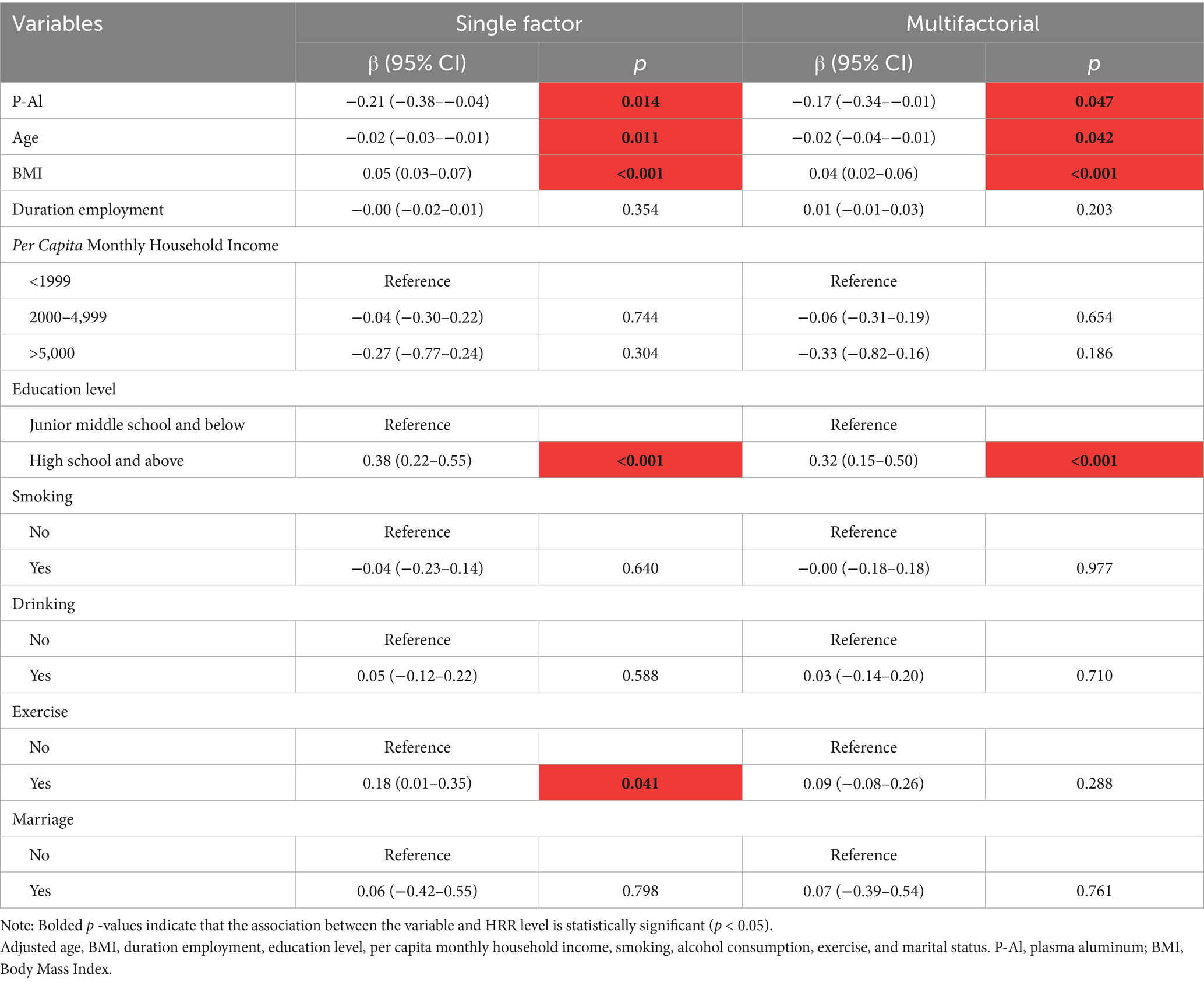 Multiple linear regression models were used to explore the relationship between P-Al, HRR, and MoCA total scores, and univariate analyses were not adjusted for confounding variables, such as age, BMI, duration employment, education level, per capita monthly household income, smoking, alcohol consumption, exercise, and marital status, so further multivariate analyses were performed to rule out the above variables, followed by restricted cubic spline (RCS) to reflect the dose–response relationship of P-Al with HRR and MoCA total score.