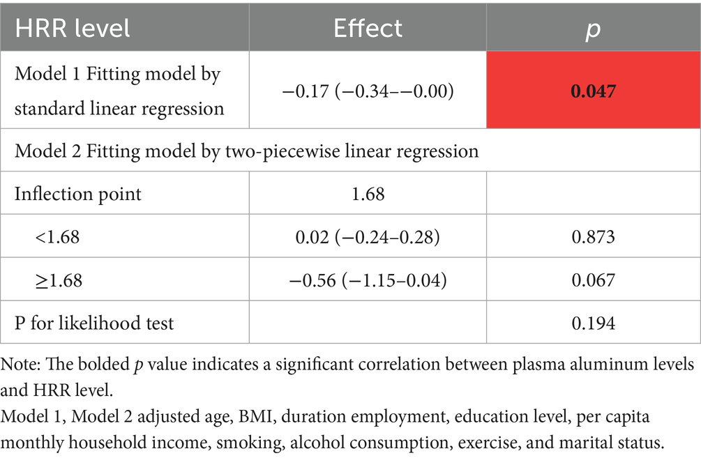 Analyzing the relationship between aluminum exposure level and HRR, the results of univariate analysis showed that for each unit increase in aluminum exposure level, HRR decreased by 0.21 units on average (p < 0.05), and after controlling for the other variables, this relationship was still significant, but with a slight decrease in β-value (from −0.21 to −0.17), as shown in Table 4. Based on the RCS curves as well as the analysis of the threshold effect, it was found that there was a dose–response relationship between HRR levels and plasma aluminum concentrations, but no nonlinear relationship was found between the two (As shown in Figure 1B; Table 5).