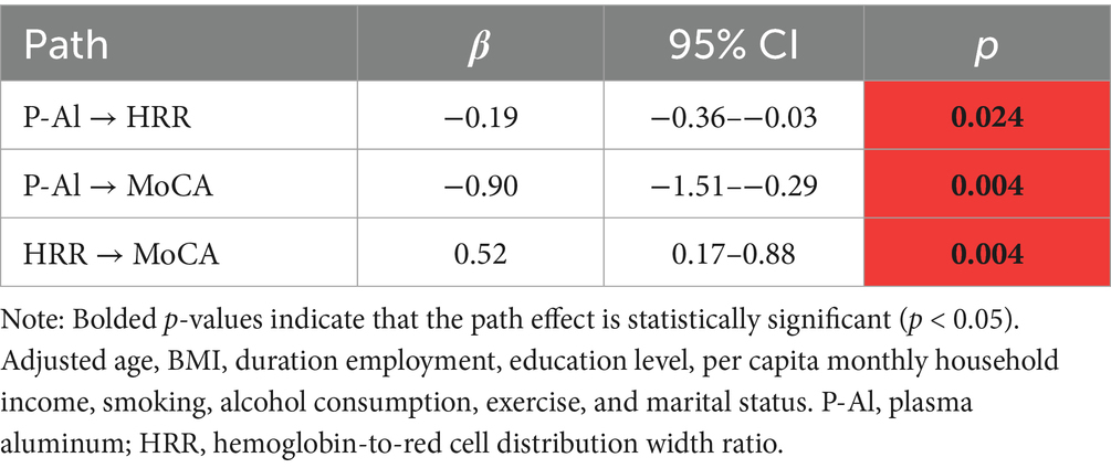 Citation: Wang R-n, Wang Z-h, Hu W-c, Kong F-p, Pei Z-y, Song J, Lu X-t and Pan B-l (2025) Hemoglobin-to-red blood cell distribution width ratio in the relationship between occupational aluminum exposure and cognitive function impairment: a mediation analysis. Front. Public Health. 13:1639229. doi: 10.3389/fpubh.2025.1639229