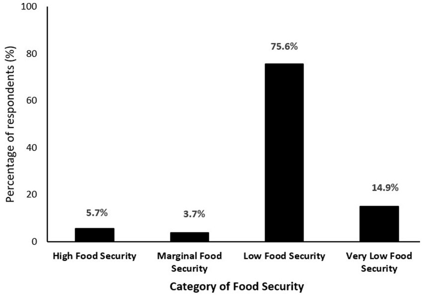 As shown in Figure 1, 90.5% of participants experienced some level of food insecurity. Specifically, 75.6% reported low food security, while an additional 14.9% reported very low food security. Only 5.7% were identified as food secure, and 3.7% as marginally food secure. This indicates that nearly all participants lived with inadequate access to nutritious and sufficient food, with a substantial proportion experiencing severe deprivation.