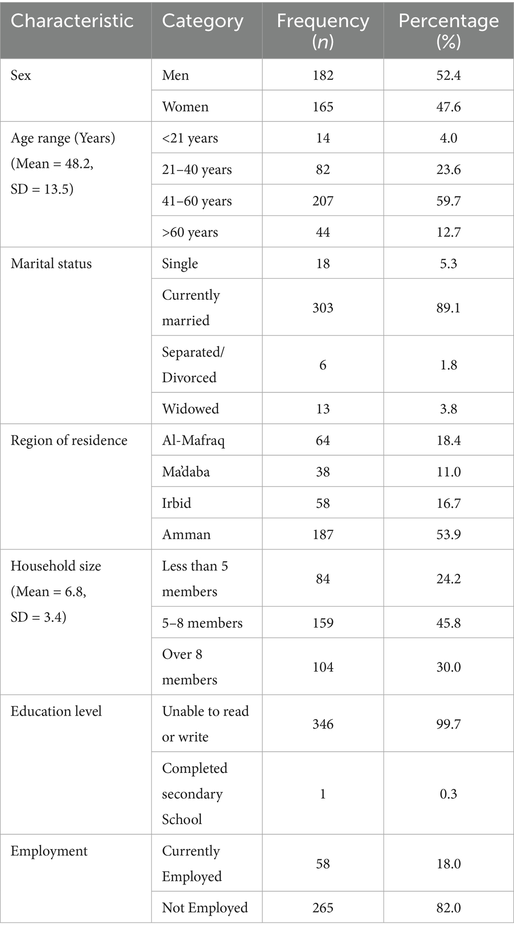 A total of 347 Romani adults with chronic illnesses participated in the study. The sample was nearly gender-balanced, with 52.4% men and 47.6% women participants. The mean age was 48.2 years (SD = 13.5), with the majority (59.7%) falling within the 41–60 age group. The majority of individuals reported being currently married (89.1%), with over half residing in the capital city, Amman (53.9%).