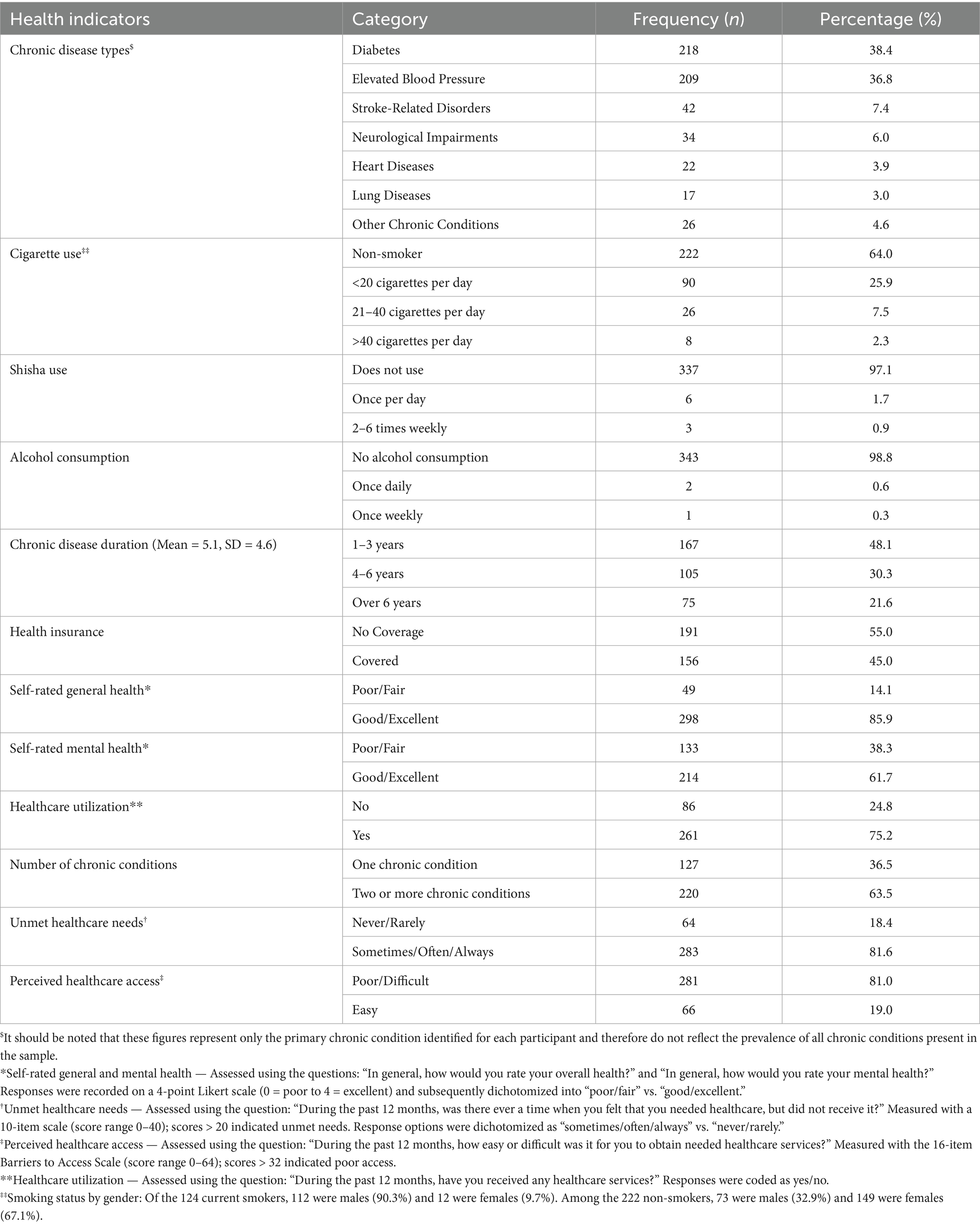 The most frequently reported primary chronic illnesses were type 2 diabetes (38.4%) and elevated blood pressure (36.8%), followed by stroke-related disorders (7.4%) and neurological impairments (6.0%). Smaller proportions reported heart disease (3.9%), lung disease (3.0%), or other chronic conditions (4.6%). On average, participants had been living with their chronic condition for 5.1 years (SD = 4.6), and 21.6% had lived with it for more than 6 years. Over half (55.0%) lacked health insurance coverage. Most participants were non-smokers (64.0%) and reported no alcohol consumption (98.8%). Regarding self-perceived health, 14.1% rated their general health as poor or fair, and 38.3% rated their mental health as poor or fair. In the past 12 months, 75.2% reported utilizing healthcare services, yet 81.6% experienced unmet healthcare needs, often due to cost, availability, or other access barriers. Perceived access to healthcare was generally poor, with 81.0% reporting difficulty obtaining needed services. Most participants (63.5%) were living with two or more chronic conditions, underscoring the complex health needs of this population (Table 2).