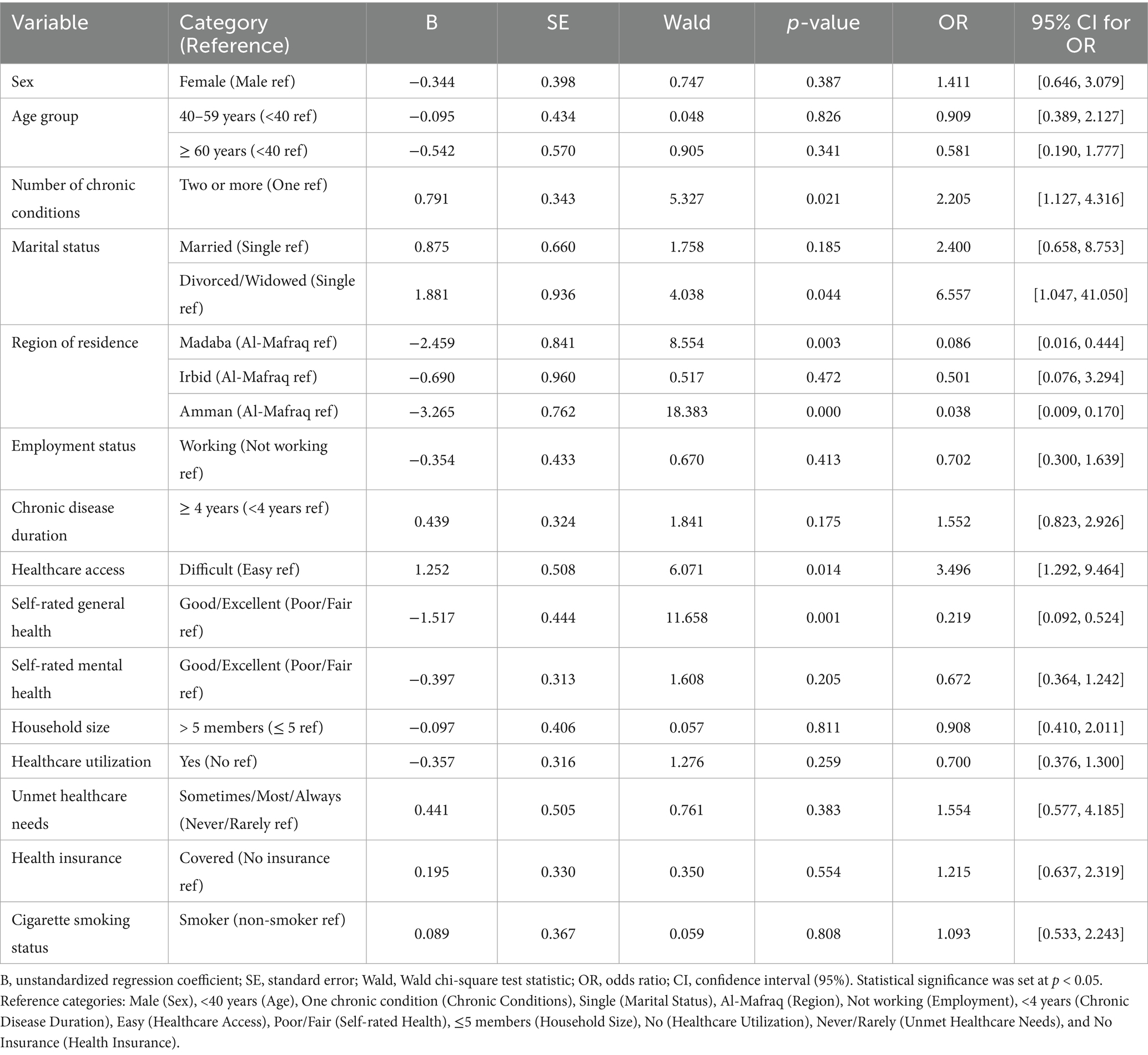 • Number of chronic conditions: Participants with two or more chronic diseases had more than twice the risk of food insecurity compared to those with only one condition (OR = 2.21, 95% CI: 1.13–4.32, p = 0.021).
