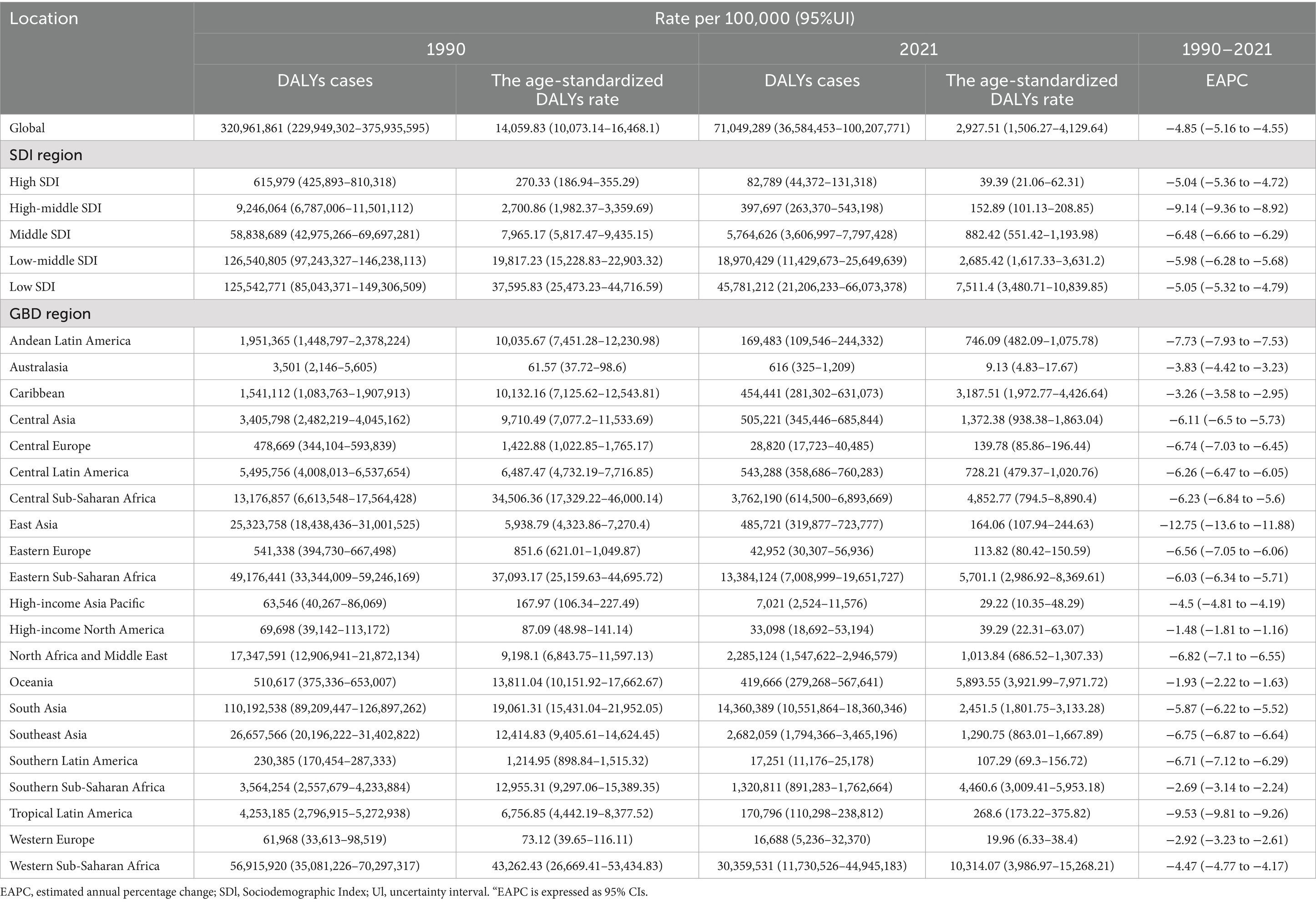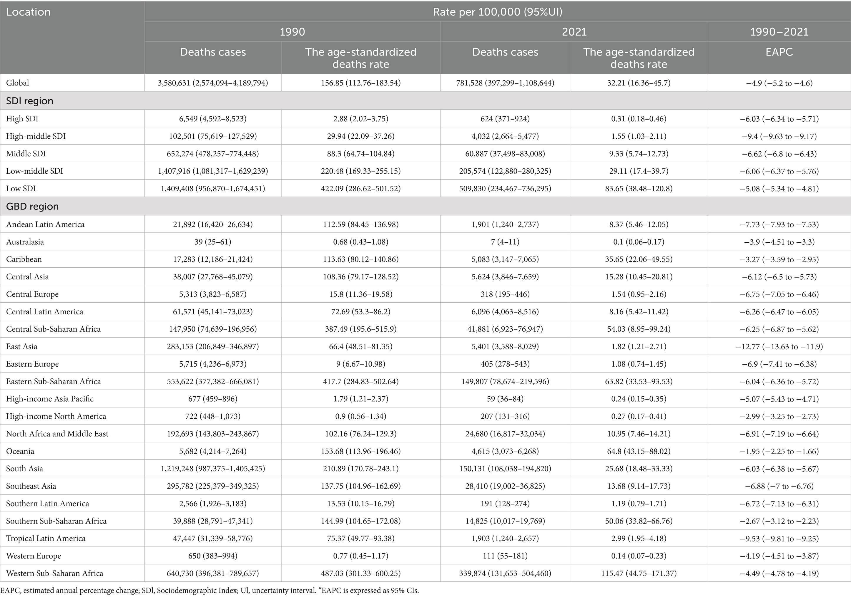 Conclusion: Despite substantial progress, GF remains a critical public health challenge, with pronounced disparities persisting in low-SDI regions. Urgently needed are targeted interventions—particularly for children under 5 in these settings—to address the inequitable burden. These conclusions should be interpreted in light of key limitations: the analysis relies on modeled GBD 2021 estimates that may be biased due to data sparsity and cause-redistribution assumptions in low-SDI contexts; furthermore, incidence/prevalence and intervention coverage were not assessed.