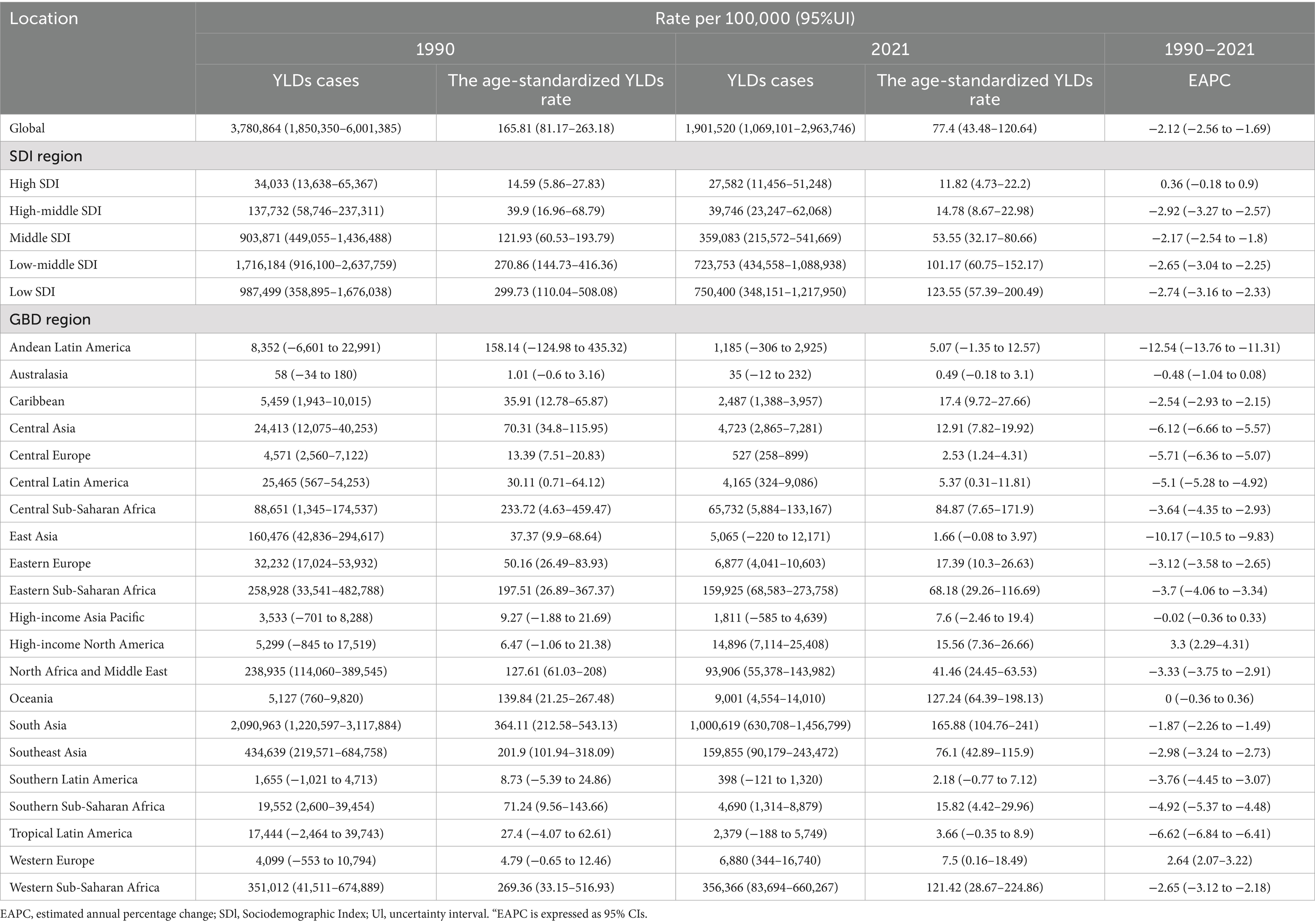 Results: From 1990 to 2021, global deaths, DALYs, YLDs, and YLLs for GF declined by 78.17, 77.86, 49.71, and 78.20%, respectively. China exhibited even more pronounced declines (98.16, 98.15, 97.10, and 98.15%). The burden was concentrated in children under 5, with males disproportionately affected. Low-SDI regions, particularly Western Sub-Saharan Africa and South Asia, accounted for over 60% of the global burden, with ASRs up to 1,000 times higher than in high-SDI regions.