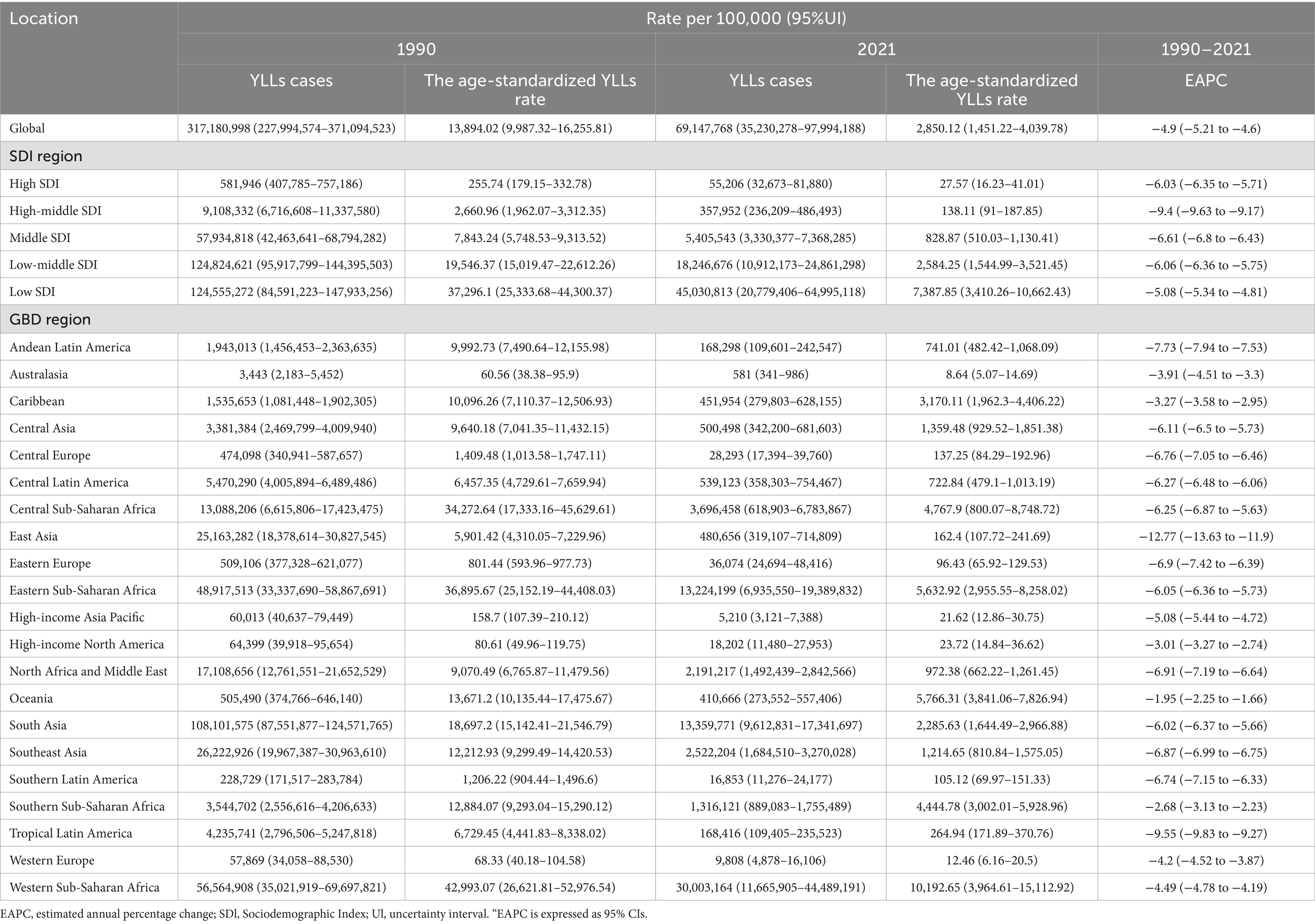 YLLs: Years of Life Lost due to premature mortality, computed as the product of deaths and standard life expectancy at age of death per GBD reference life table. YLDs: Years Lived with Disability, computed as prevalence of sequelae multiplied by disability weights derived from GBD population surveys. DALYs: Disability-Adjusted Life Years, calculated as DALYs = YLLs + YLDs. Age-standardized rates (ASRs): Direct age-standardization to the GBD world standard population, expressed per 100,000 population. SDI: Composite index of lag-distributed income per capita, average educational attainment in those aged 15+, and total fertility rate under age 25, scaled 0–1 and grouped into five quintiles (low to high).
