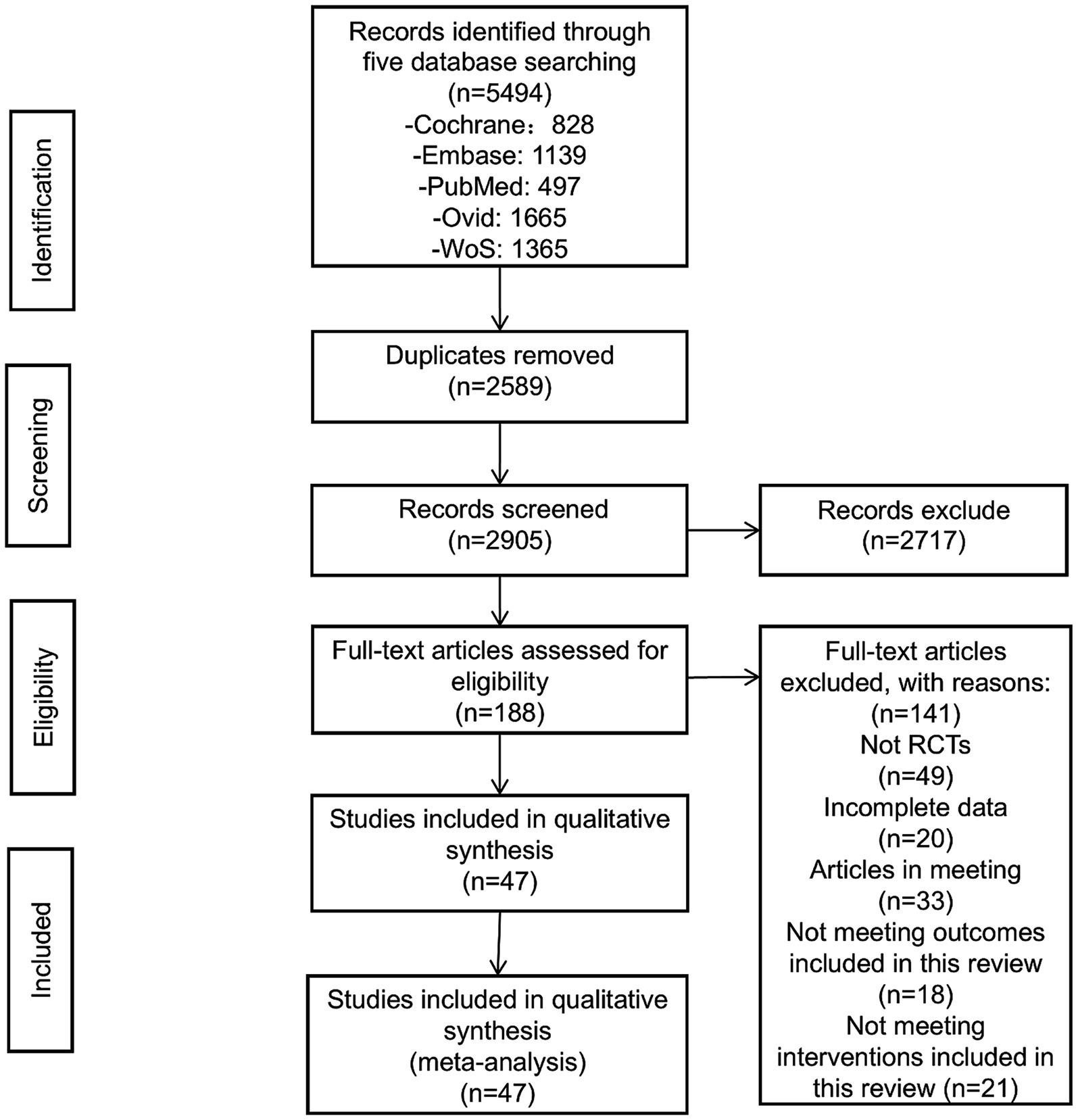 Through the established literature search strategy, an initial retrieval identified 5,494 articles. After removing duplicates, 2,905 articles remained. Upon reviewing the titles and abstracts, 2,717 articles were excluded, leaving 188 for full-text screening. After thoroughly reading the full text, articles that were not randomized controlled trials, had incomplete data, were conference proceedings, or did not meet the intervention criteria of this review were excluded, resulting in the removal of 141 articles. Finally, 47 articles were included (18–64) (Figure 1).