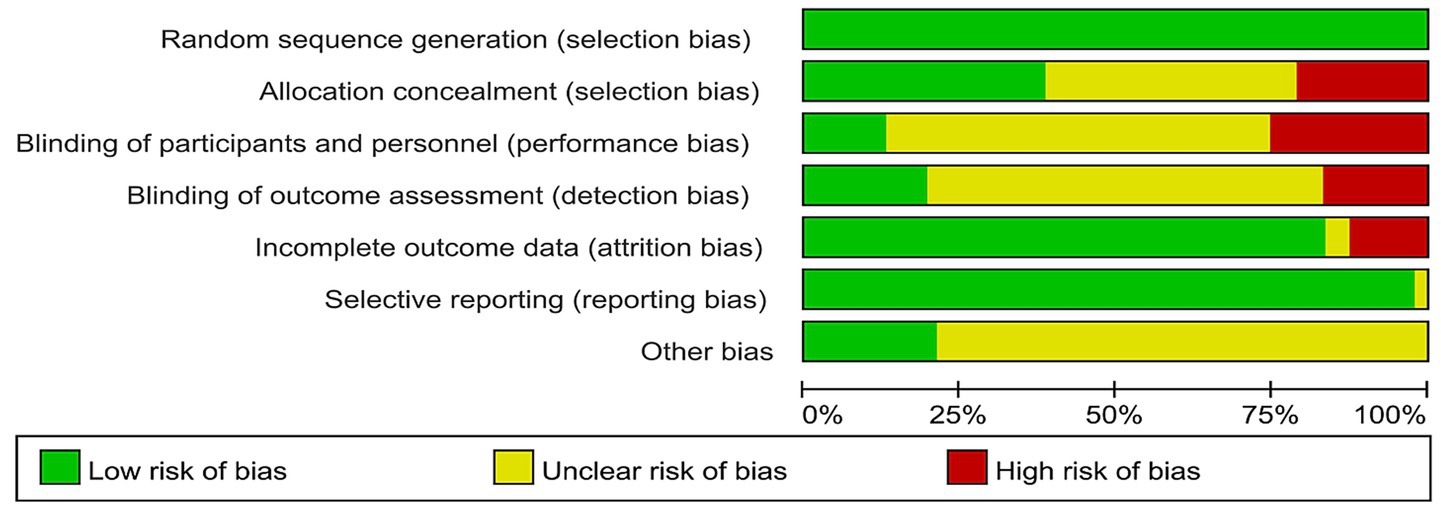 Bias risk assessment of the included studies were conducted according to the Cochrane Handbook for Systematic Reviews of Interventions 5.1.0, with specific criteria based on seven aspects: (1) generation of random sequence; (2) allocation concealment; (3) blinding of participants; (4) blinding of intervention providers and outcome assessors; (5) completeness of outcome data; (6) selective reporting; and (7) other sources of bias. Based on these criteria, the included studies were categorized into three levels of bias risk: high risk (five or more aspects), moderate risk (three or four aspects), and low risk (two or fewer aspects). The bias risk assessment was independently performed by two researchers, with cross-checking. In case of disagreements, a third reviewer resolved the issues (16).