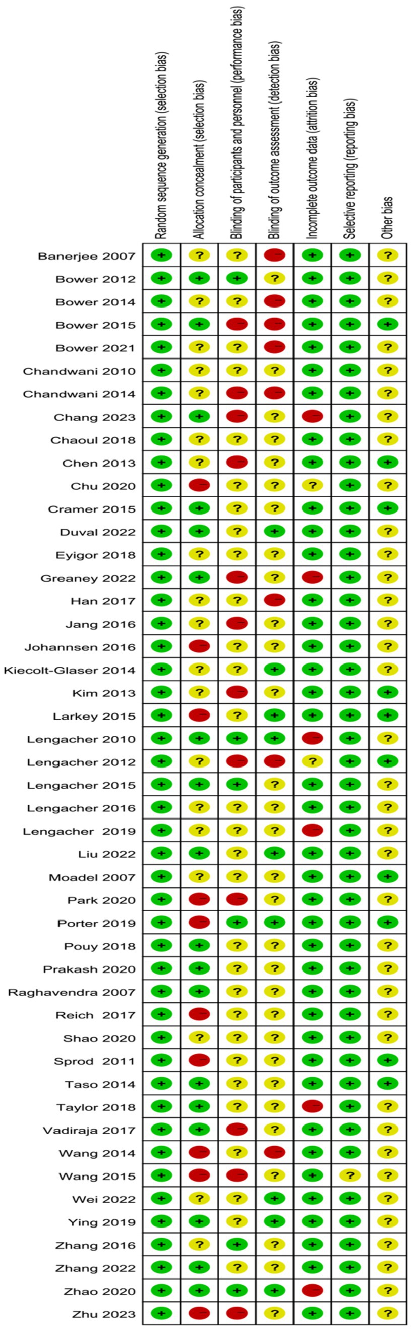 This study ultimately included 11 high-quality articles, 33 moderate-quality articles, and 3 low-quality articles. All included articles described the method of random grouping. Eighteen articles mentioned the method of concealing the allocation sequence; 12 articles described the process of implementing blinding, with 3 employing a double-blind method and 9 using a single-blind method. Thirty-nine articles provided complete outcome reports (Figures 2, 3).
