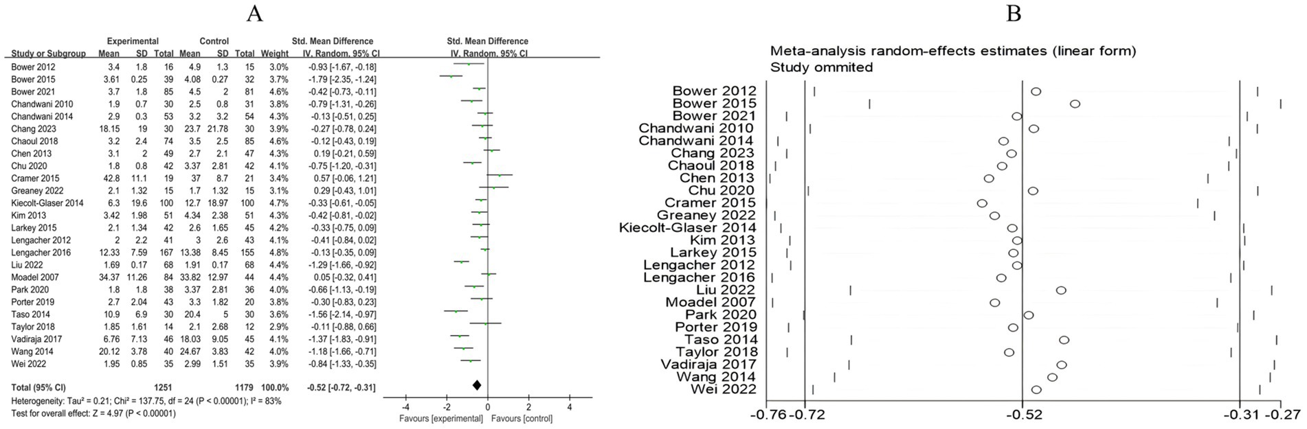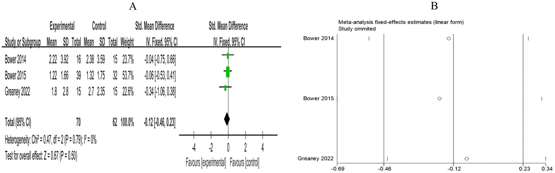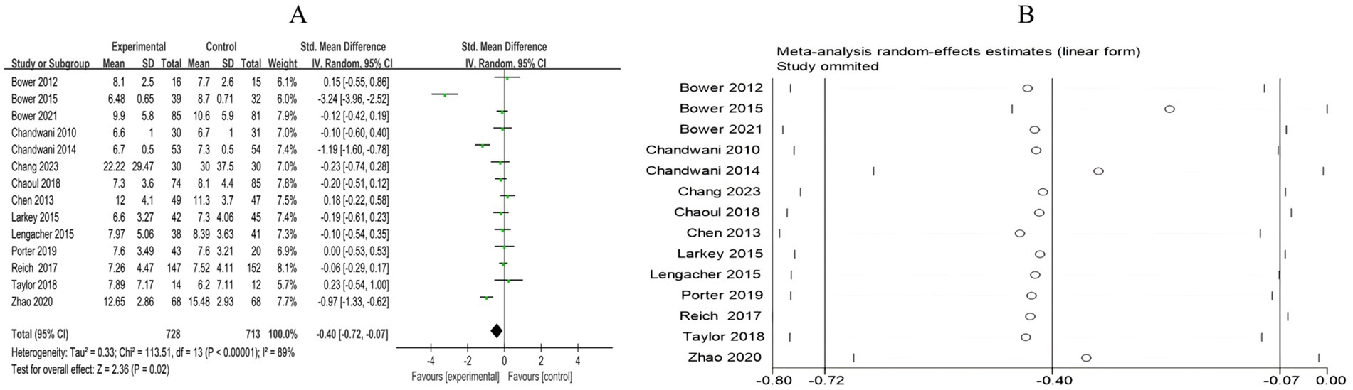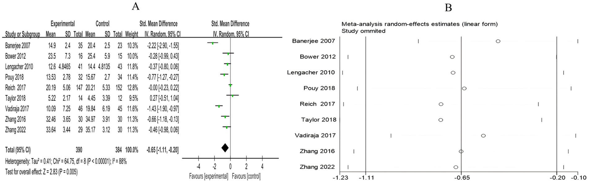Figure 9. (A) Forest plot of the effect of mind–body exercise on fatigue in breast cancer patients. (B) Sensitivity analysis of fatigue levels.