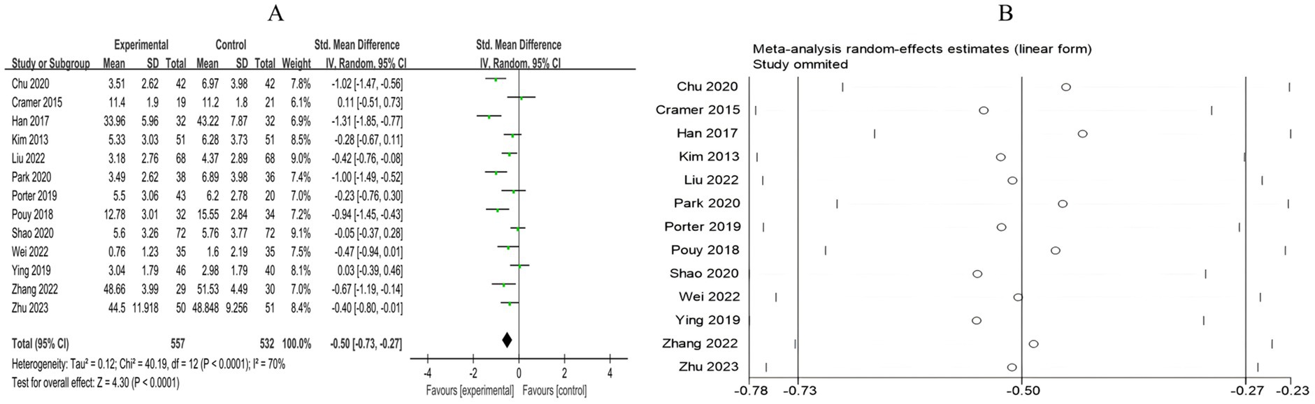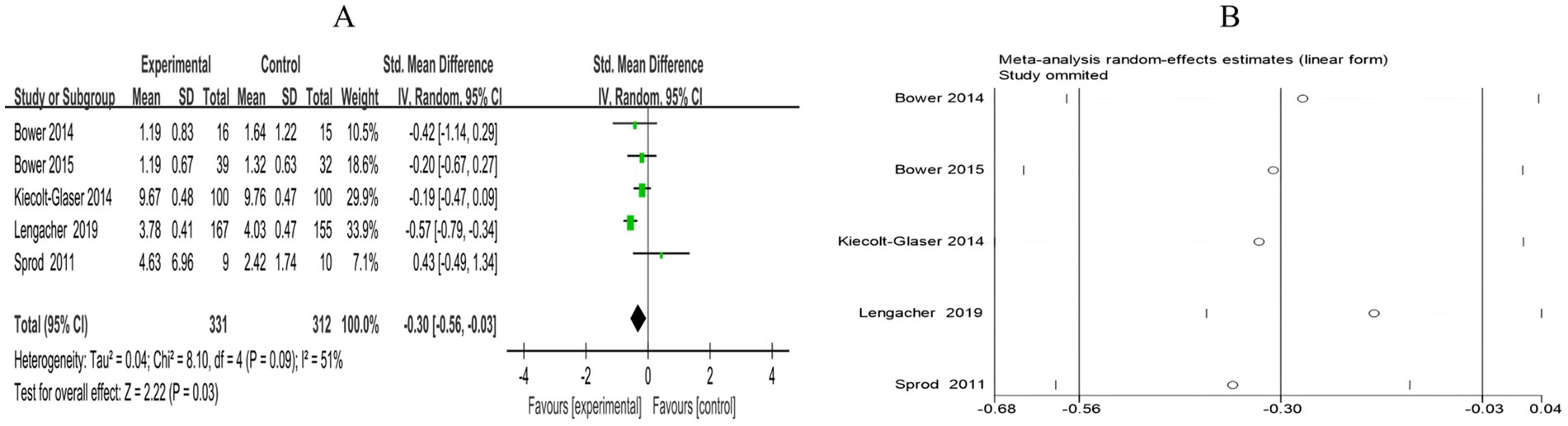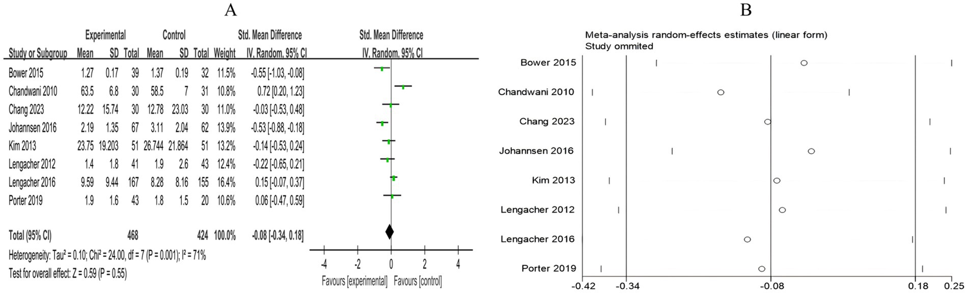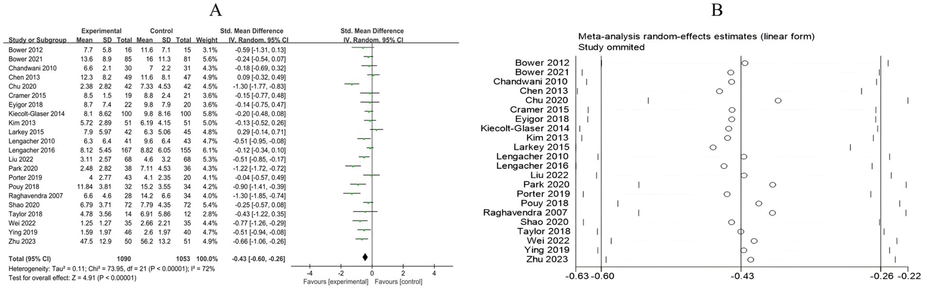 Figure 9. (A) Forest plot of the effect of mind–body exercise on fatigue in breast cancer patients. (B) Sensitivity analysis of fatigue levels.