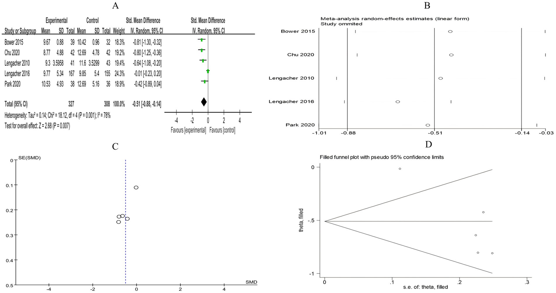 Figure 7. (A) Forest plot of the effect of mind–body exercise on FCR in breast cancer patients. (B) Sensitivity analysis of FCR levels. (C) Funnel plot of FCR. (D) Funnel plot of FCR using Trim-and-Fill method.