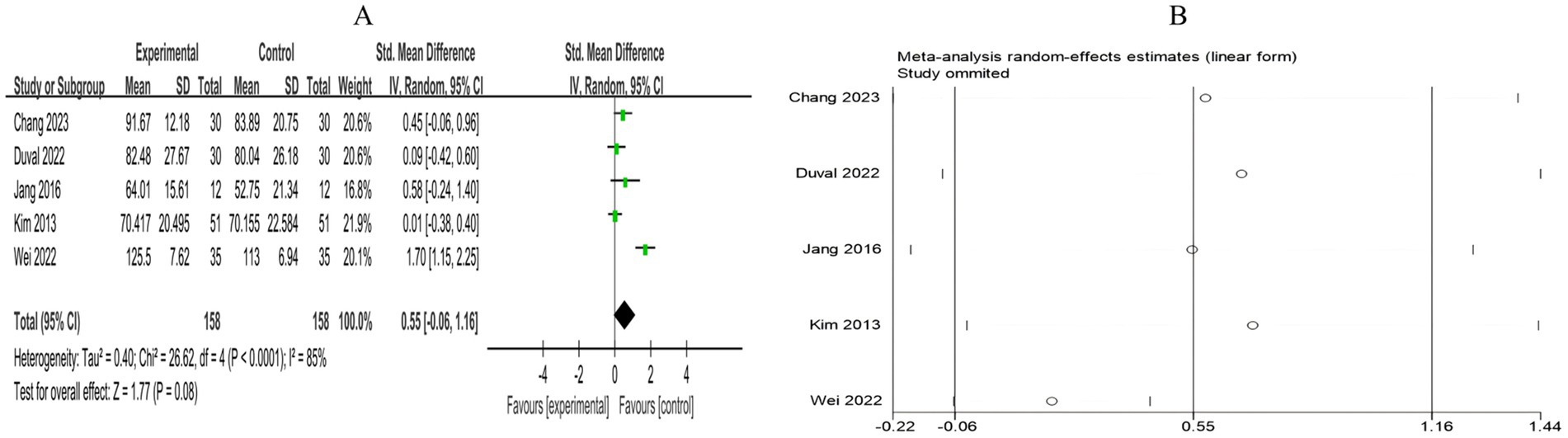 Figure 10. (A) Forest plot of the effect of mind–body exercise on cognitive function in breast cancer patients. (B) Sensitivity analysis of cognitive function levels.