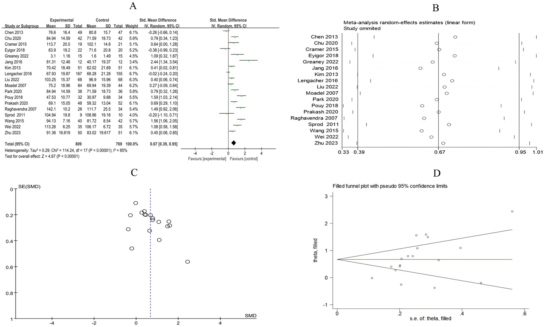 Figure 12. (A) Forest plot of the effect of mind–body exercise on QOL in breast cancer patients. (B). Sensitivity analysis of QOL levels. (C) Funnel plot of QOL. (D) Funnel plot of QOL using Trim-and-Fill method.