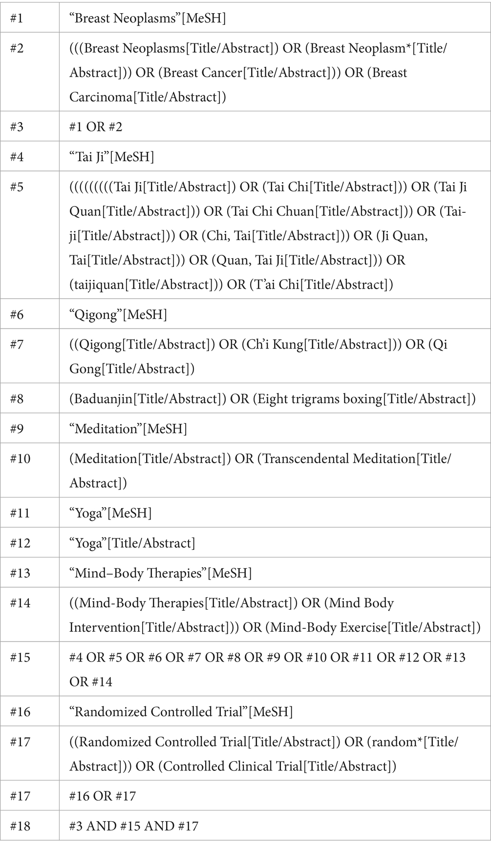 A search was conducted in Cochrane, EMBASE, Ovid, PubMed, and Web of Science from their inception until October 2024. The search strategy was based on the PICOS framework: (P) Population: breast cancer patients; (I) Intervention: mind–body exercise; (C) Comparison: standard care and appropriate rehabilitation measures; (O) Outcomes: mind–body exercise assessments in breast cancer patients; (S) Study type: randomized controlled trials. The detailed search strategy is shown in Table 1 (using PubMed as an example).