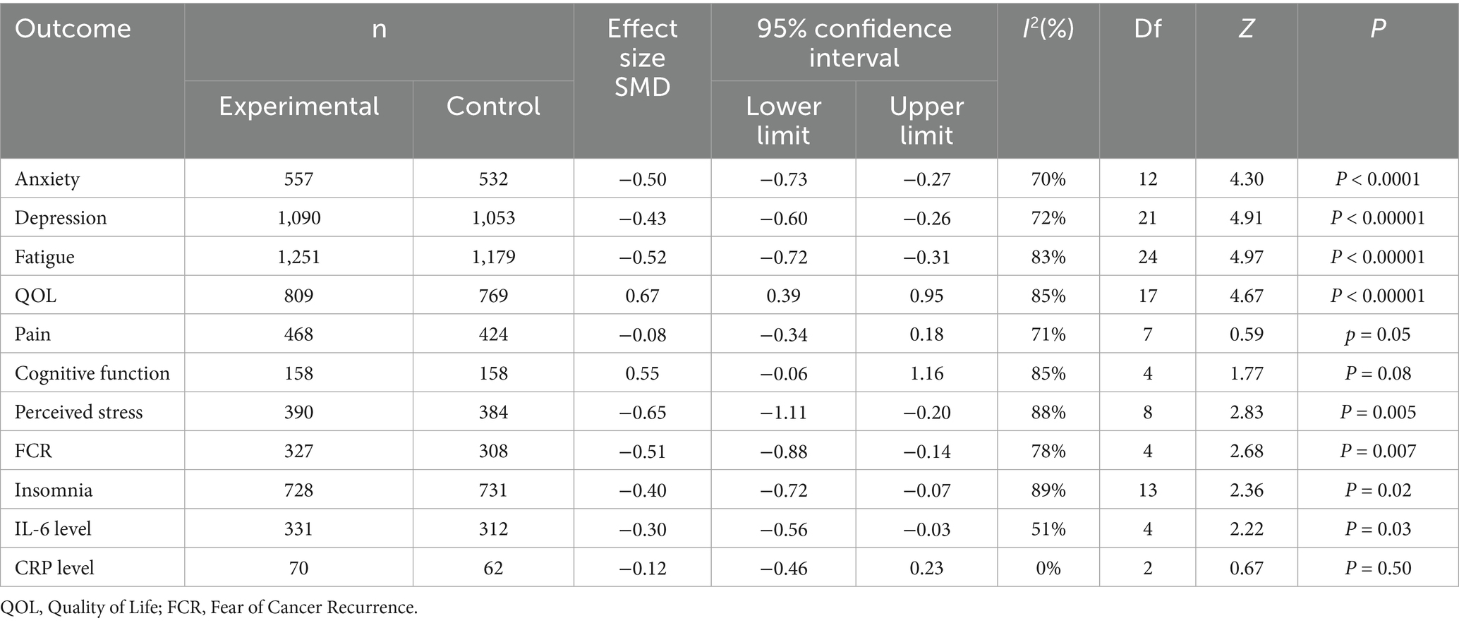 Results: A total of 47 RCTs involving 4,537 breast cancer patients were included. Meta-analysis results showed that compared to standard care, mind–body exercise significantly improved anxiety (SMD = −0.50, 95% CI [−0.73, −0.27], p < 0.0001), depression (SMD = −0.43, 95% CI [−0.60, −0.26], p < 0.00001), insomnia (SMD = −0.40, 95% CI [−0.72, −0.07], p = 0.02), fatigue (SMD = −0.52, 95% CI [−0.72, −0.31], p < 0.00001), and FCR (SMD = −0.51, 95% CI [−0.88, −0.14], p = 0.007). Furthermore, it significantly reduced perceived stress (SMD = −0.65, 95% CI [−1.11, −0.20], p = 0.005), lowered IL-6 levels (SMD = −0.30, 95% CI [−0.56, −0.03], p = 0.03), and improved overall quality of life (SMD = 0.67, 95% CI [0.39, 0.95], p < 0.00001). Sensitivity analyses indicated that the pooled effect sizes were stable.
