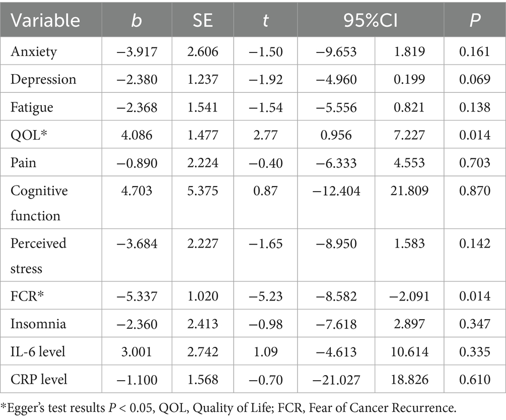 Sensitivity analysis was conducted for all outcome measures (Figures 4B–14B). The sensitivity analysis was performed using a leave-one-out approach. The results showed that the direction of effect sizes remained unchanged after excluding individual studies, indicating that the results were relatively stable. Publication bias was assessed, and Egger’s test showed no significant bias (p > 0.05), with the funnel plot displaying symmetry, indicating no publication bias. The funnel plots and Egger’s test showed symmetry for most outcome measures, with p > 0.05. Only cancer recurrence fear (Figure 7C) and quality of life (Figure 12C) showed p < 0.05 in Egger’s test (Table 4). We attempted trim-and-fill analysis (Figures 7D, 12D) but did not find any significant impact on the results.
