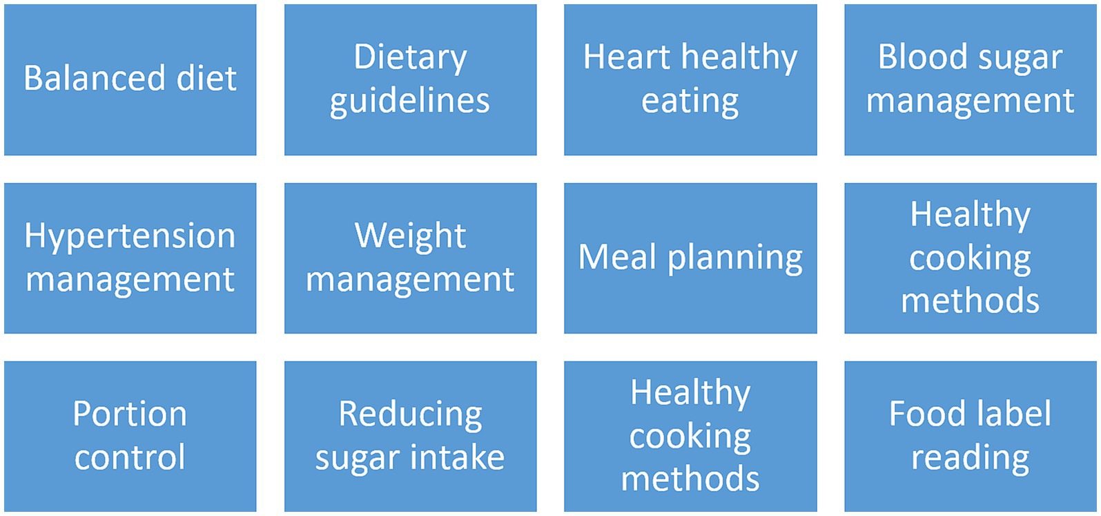 Figure 2. Nutrition intervention session topics: this figure covers the weekly nutrition education sessions tailored to female secondary school teachers, as part of the proposed intervention to reduce NCDs risk.